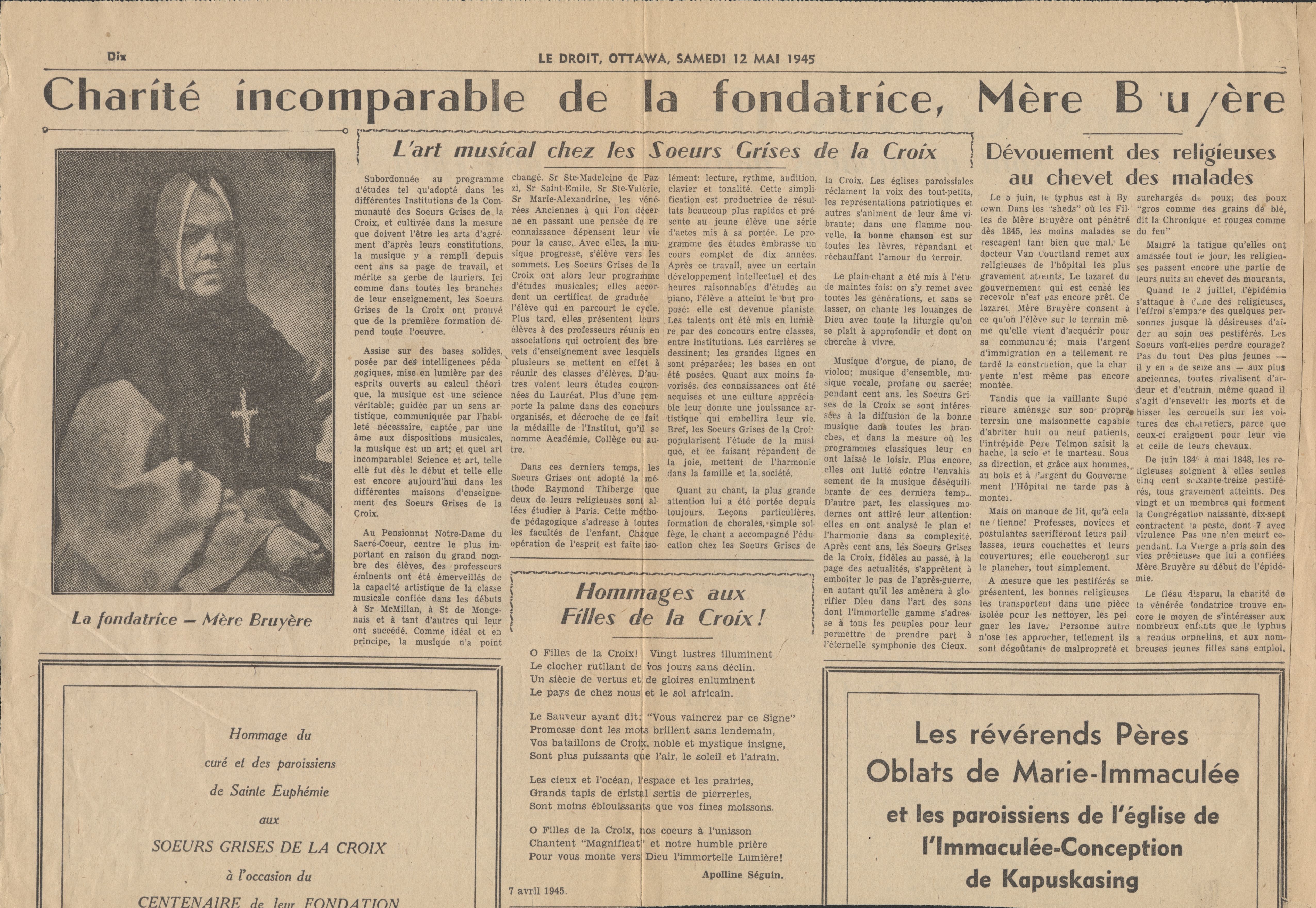 1 Émilien Lamirande, Élisabeth Bruyère, 1818-1876 : fondatrice des Sœurs de la Charité d'Ottawa, Montréal, Éditions Bellarmin, 1993, p. 141.