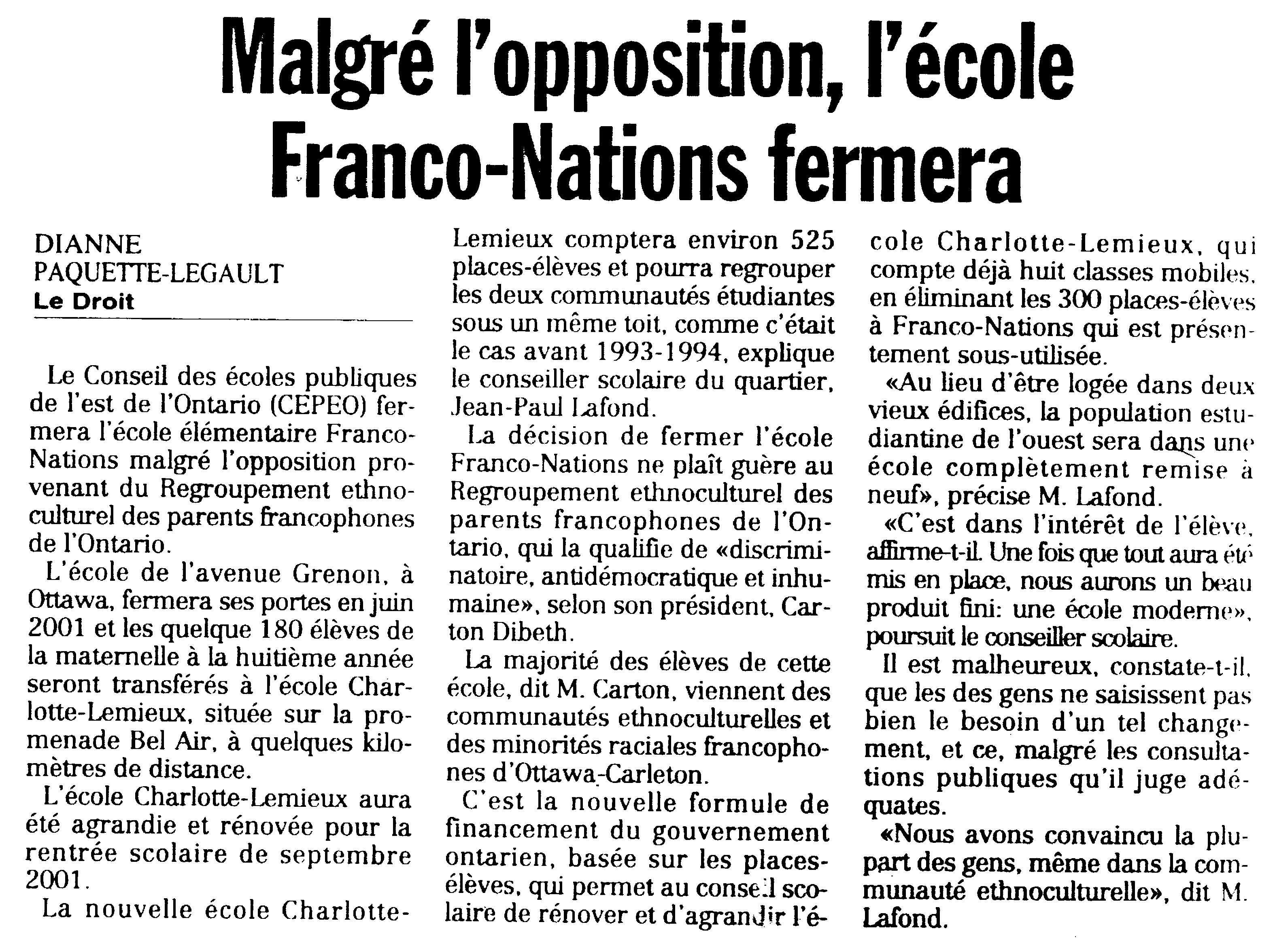 Dans le seul secteur de l’éducation, on compte une quinzaine d’organismes francophones à vocation provinciale. Ils sont presque tous nés à Ottawa, où ils ont établi leur siège social. Le dernier à avoir vu le jour, le Regroupement ethnoculturel des parents francophones de l’Ontario, est issu de la résistance de certains parents à la fermeture de l’École Franco-Nations, à la fin des années 1990. Logée dans un édifice vieillissant de l’ouest d’Ottawa, cette école de quartier accueille de nombreux élèves d’origine haïtienne, congolaise et somalienne. Le transfert des enfants vers l’École Charlotte-Lemieux, située de l’autre côté de l’autoroute 417, aura bel et bien lieu en 2001, comme prévu. Mais l’organisme restera pour outiller les parents issus des communautés culturelles dans leurs rôles familiaux, scolaires et sociaux.