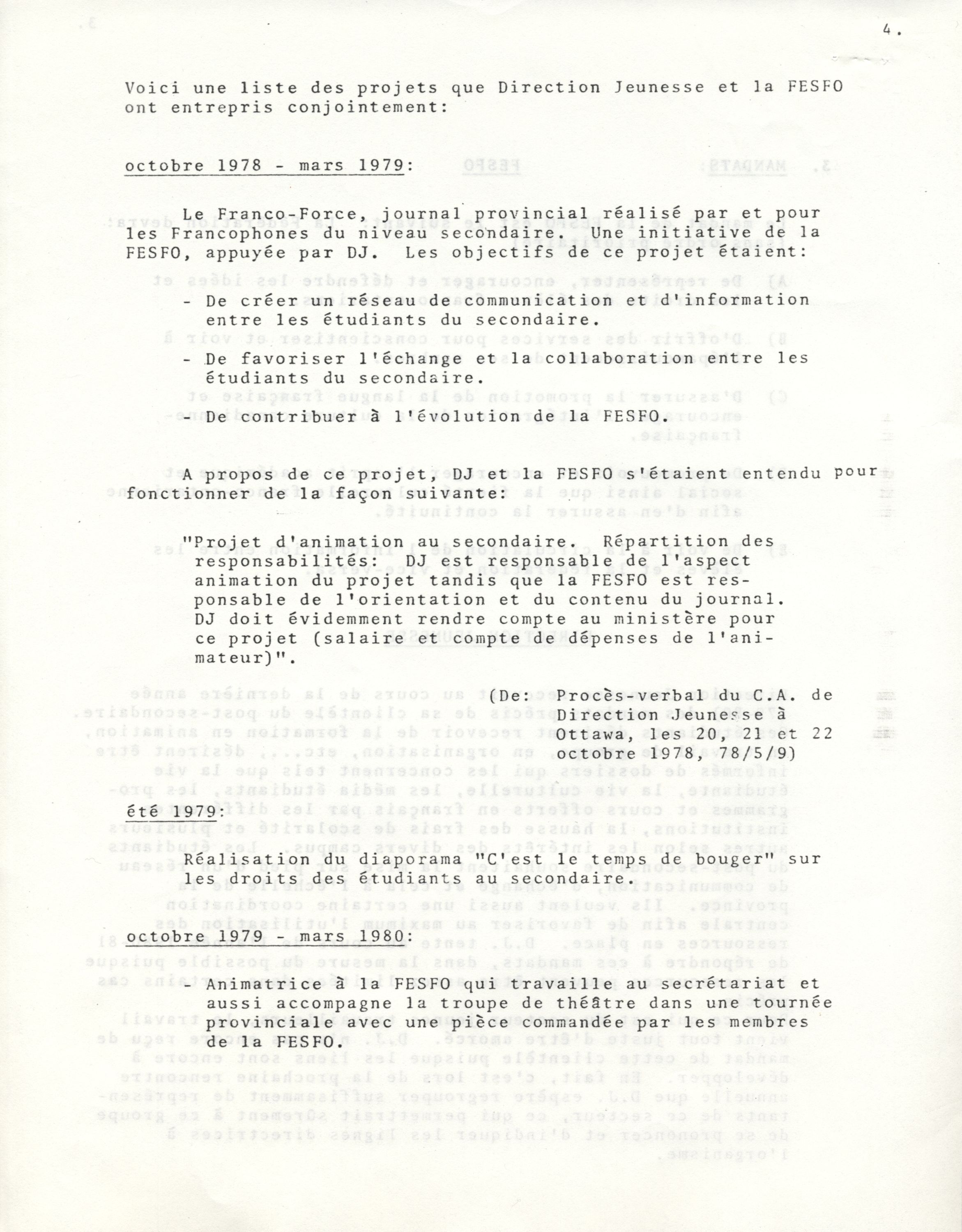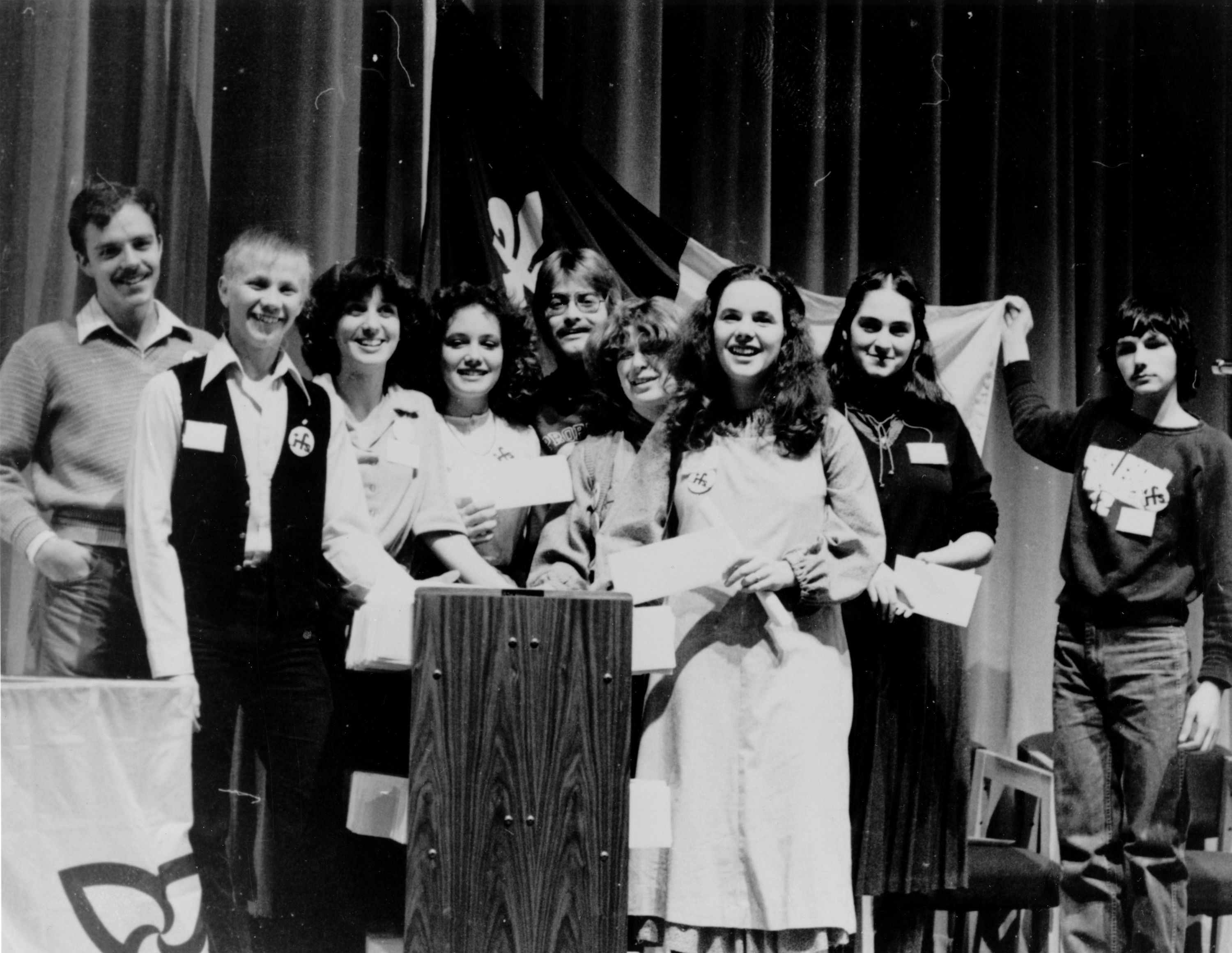 Les années 1960 représentent un point tournant pour la jeunesse francophone d’Ottawa. Dans la capitale, comme ailleurs dans le monde, la montée de la contre-culture et de la démocratie participative conduira plusieurs jeunes issus du baby-boom (nés entre 1945 et 1960) à remettre en cause le traditionalisme et l’élitisme de leurs aînés. C’est l’époque des grandes manifestations étudiantes, de l’entrée en scène des hippies, du psychédélisme et de la critique de l’autorité sous toutes ses formes. L’Association de la jeunesse franco-ontarienne (AJFO), fondée en 1949, a du mal à s’adapter à ces nouvelles réalités. C’était prévisible : mise sur pied avec l’appui de mouvements adultes, comme l’Association canadienne-française d’éducation d’Ontario et l’Ordre de Jacques-Cartier, AJFO en partageait toujours les valeurs traditionnelles. En mai 1968 – moment épique s’il en est un –, de jeunes dissidents fondent l’Association provinciale des mouvements de jeunes de l’Ontario français (APMJOF), un organisme qui se veut plus revendicateur. La rivalité entre l’AJFO, beaucoup plus modérée, et l’APMJOF sera grande. Pendant deux ans, les deux associations se livreront une guerre sourde, jusqu’au jour où, épuisées par tant de conflits, elles accepteront de fusionner. En 1970, leur réconciliation donne ainsi naissance à Direction-Jeunesse (DJ).