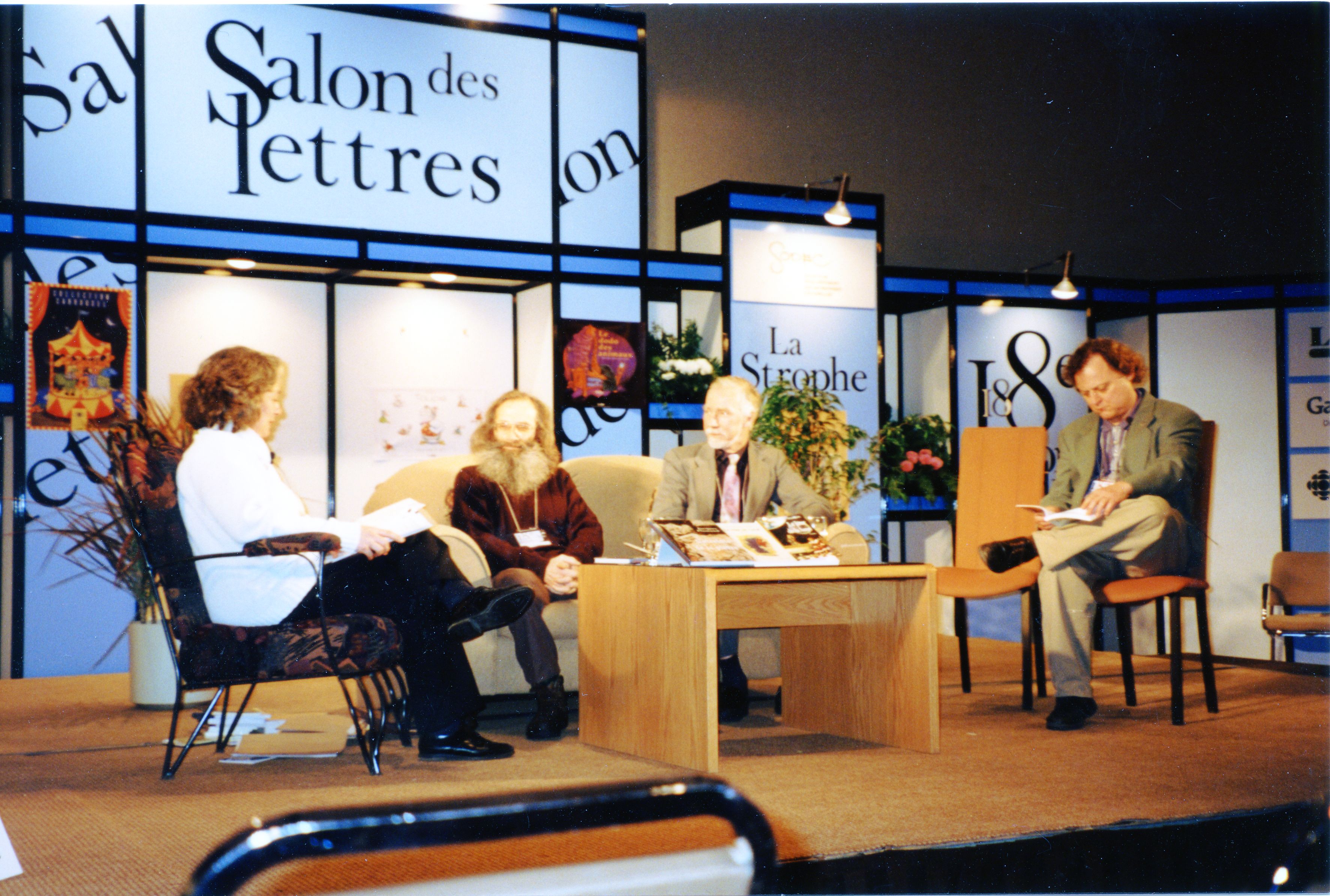 Lise Leblanc, responsable de la promotion aux Éditions L’Interligne, Monique Bertoli et Jacques Flamand des Éditions du Vermillon, au Salon du livre de Montréal, novembre 1984. Photo : Jules Villemaire.