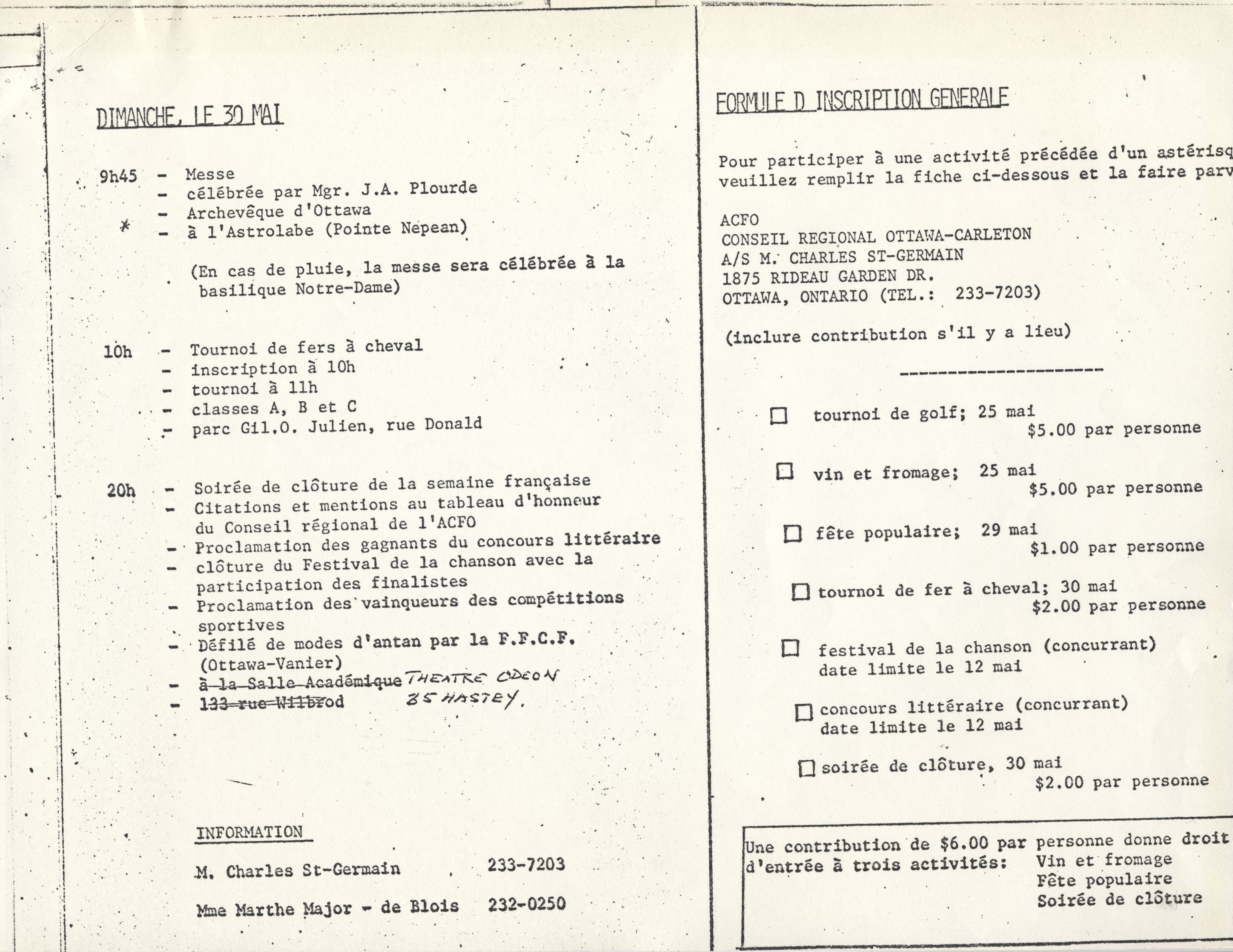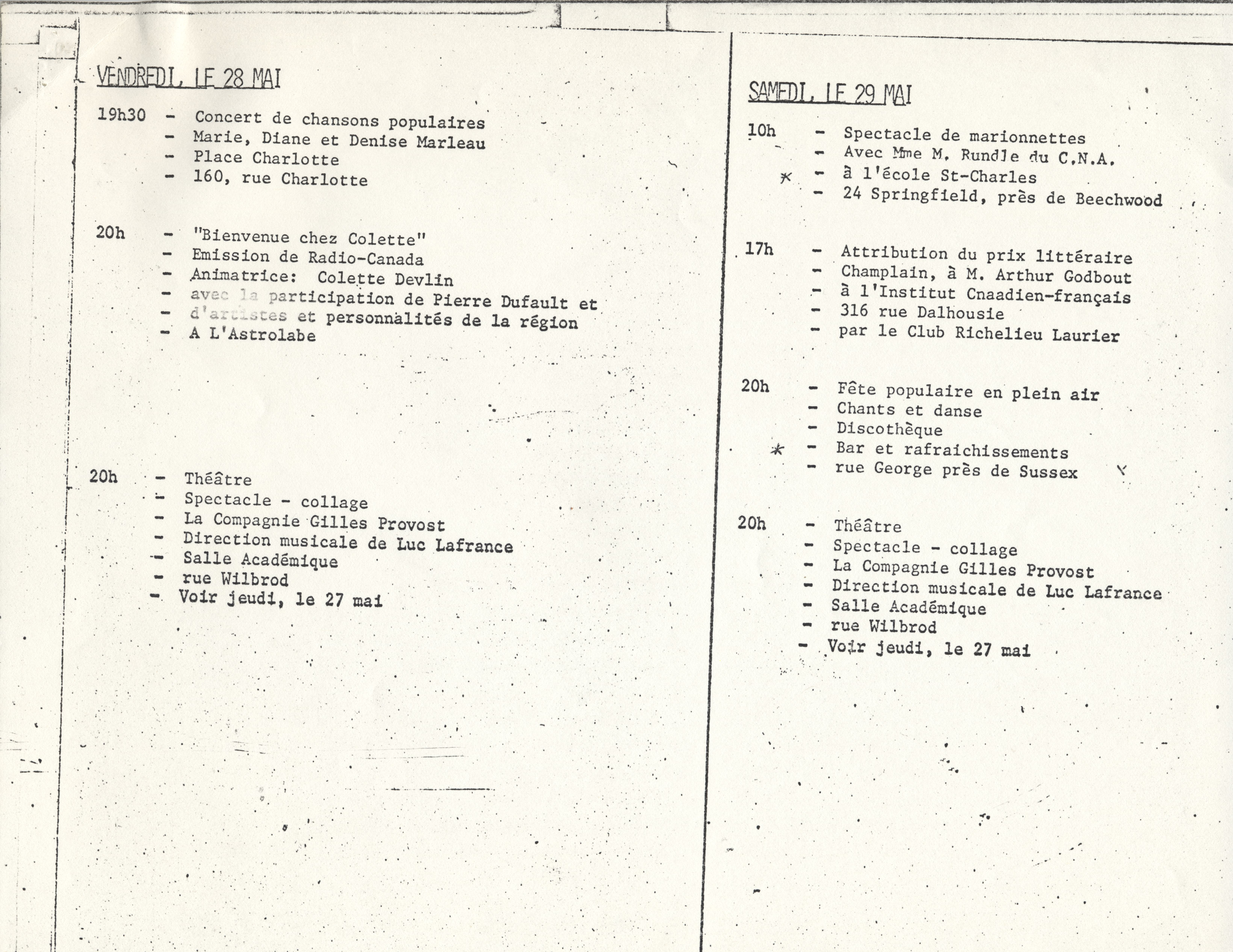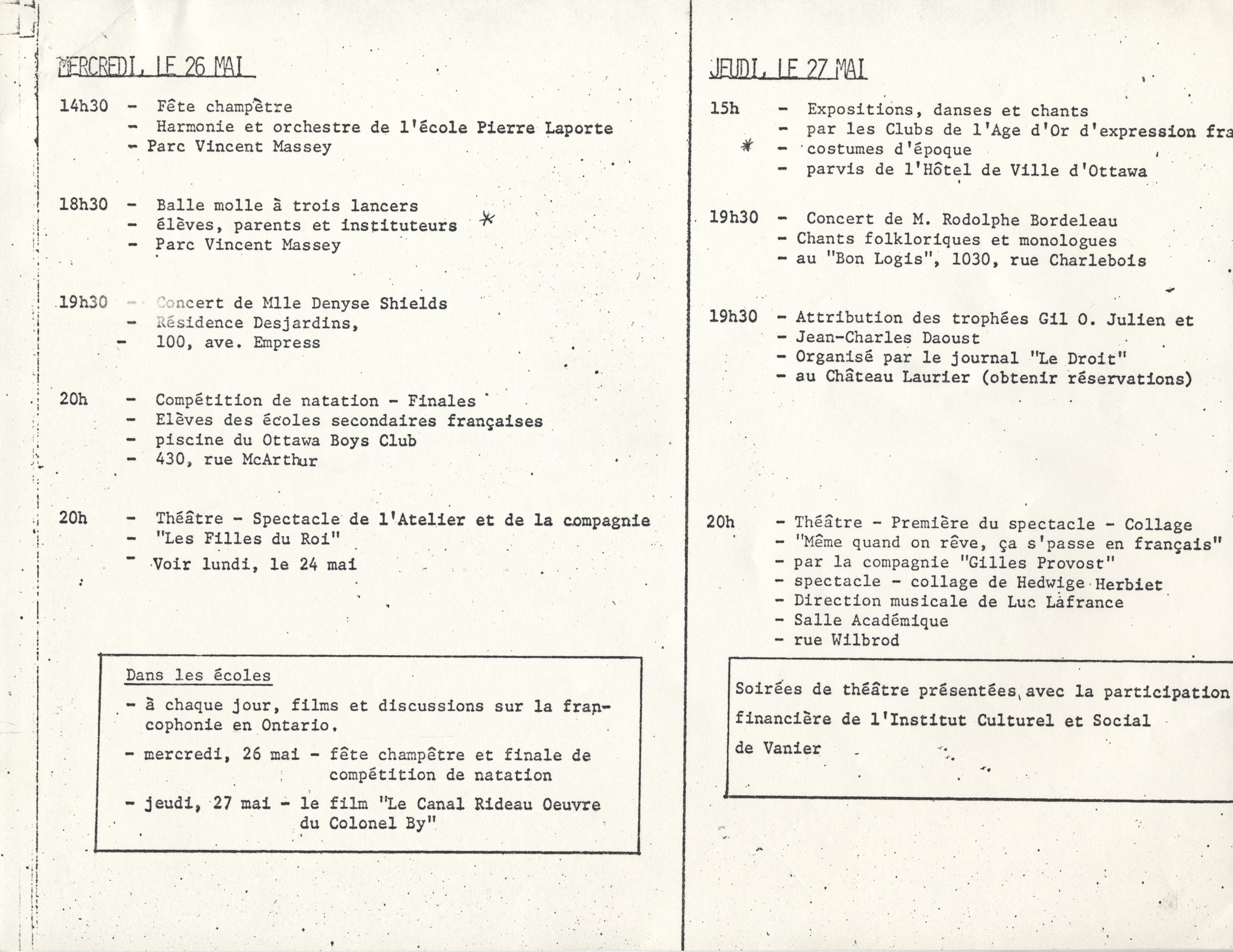 La première « Semaine française », qui a lieu à Ottawa du 24 au 30 mai 1976, est modeste. Le conseil régional de l’Association canadienne-française de l’Ontario (ACFO) réussit à organiser, avec un maigre budget, quelques activités pour souligner le 150e anniversaire de Bytown. Un pique-nique, une soirée à l’Astrolabe avec l’auteur-compositeur-interprète sudburois Robert Paquette et un récital des Chansonniers de Blackburn Hamlet en sont les moments forts. L’objectif est d’organiser une fête communautaire, qui témoigne de la fierté des francophones de la capitale.