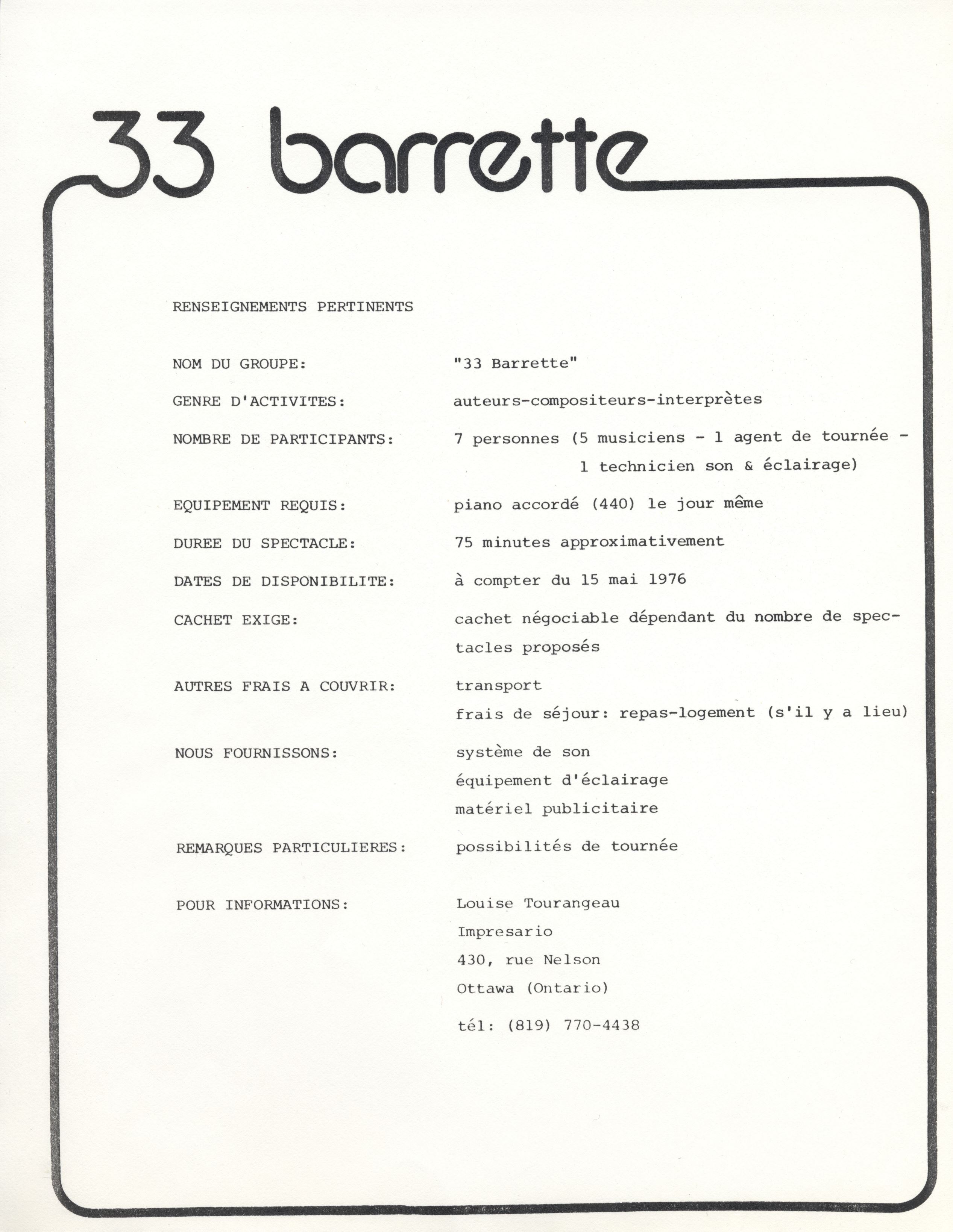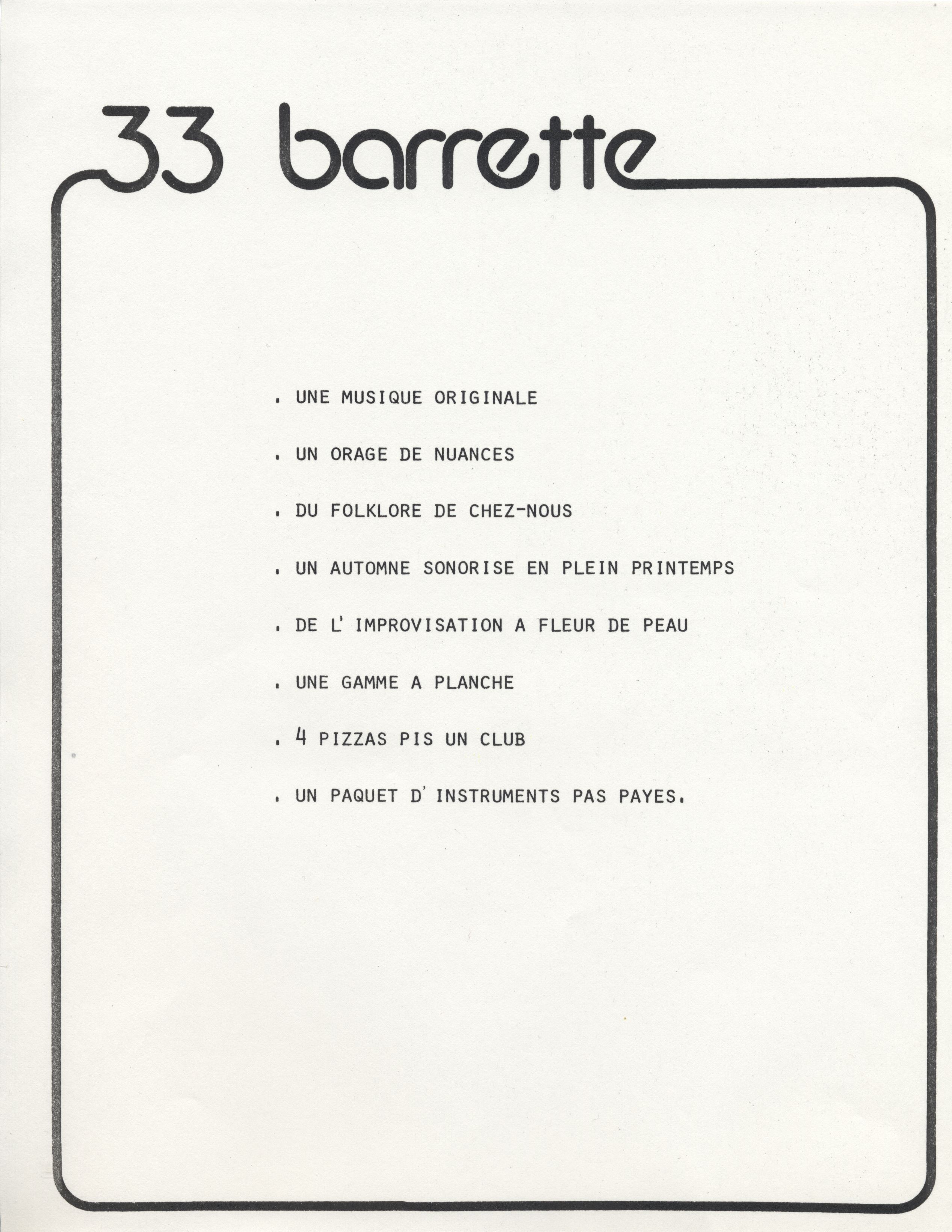 Franco-Ontarian music group, 33 Barrette [ca.197-?].