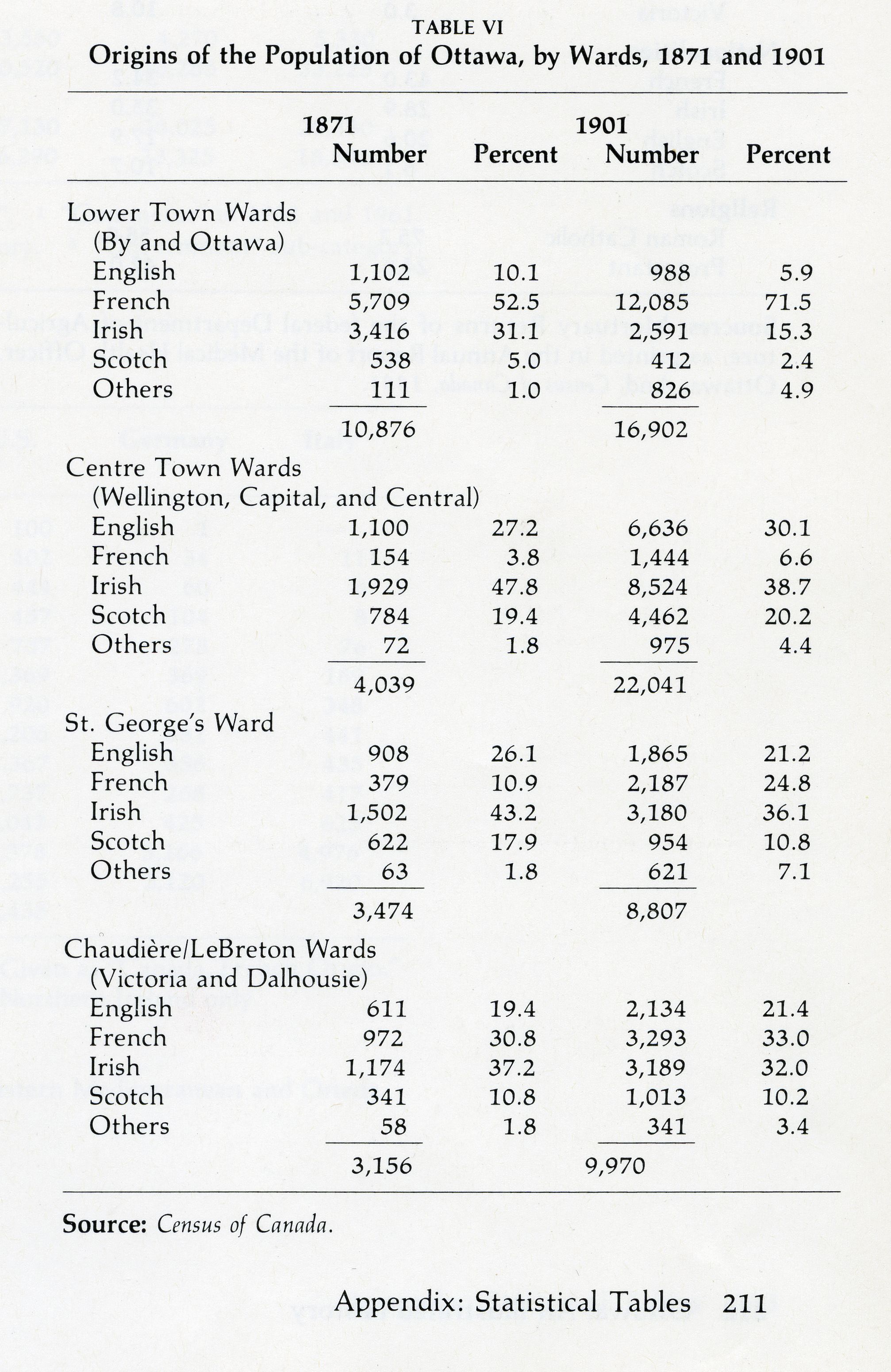 Au lendemain de la Confédération, Ottawa est divisée socialement et ethniquement, comme bien d’autres villes nord-américaines. Les Anglais et les Écossais se répartissent assez bien entre les différents quartiers de la ville, alors que les quatre cinquièmes des Canadiens français habitent dans la Basse-Ville. Ils forment la majorité de la population du quartier depuis la naissance de Bytown. Plusieurs d’entre eux vivent à l’ouest de la colline du Parlement, sur les plaines LeBreton, où ils sont à l’emploi de J.R. Booth, alors le plus grand producteur de bois d’œuvre au monde. Quant aux Irlandais, ils ont aussi investi la Basse-Ville, qui accueille le plus fort contingent du groupe. Ils constituent une proportion importante de la population du quartier « Centre Town », et sont particulièrement nombreux dans la zone qui s’étend au sud du Parlement. On ne verra d’autres groupes (Allemands, Italiens, etc.) s’imposer dans le paysage ethnique qu’au tournant du xxe siècle.