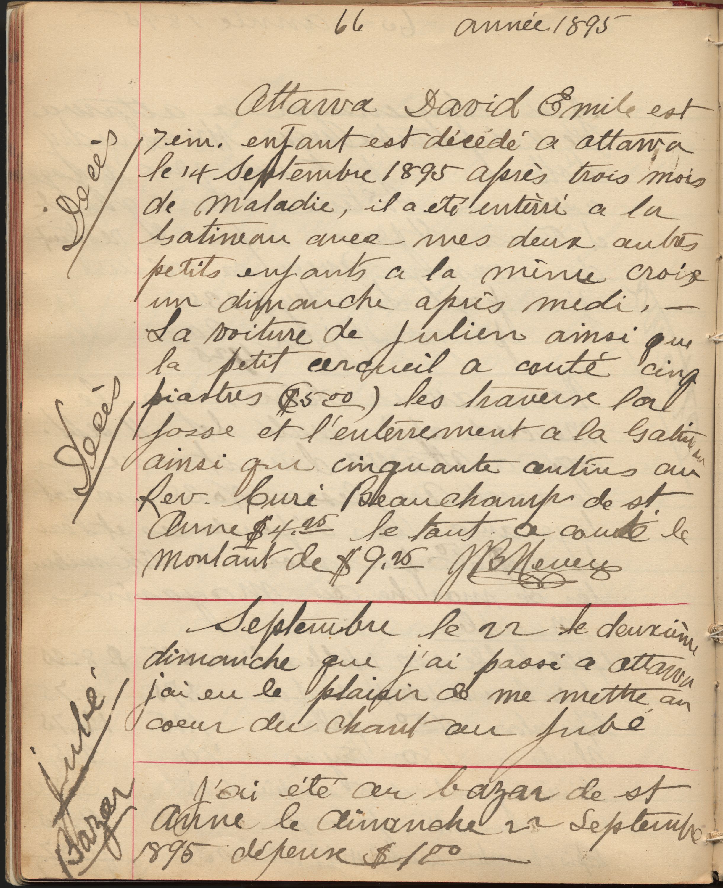 Les populations d’Ottawa ne bénéficient pas toutes de la même qualité de vie. Taylor a compilé à cet égard des données troublantes. En 1885, 43 % des décès à Ottawa sont survenus chez les Canadiens français qui ne comptent pourtant que pour 34,2 % de la population de la ville, selon le recensement. À la Basse-Ville, le district By, où ne vit que 18,1 % de la population d’Ottawa, est de loin celui où l’on compte le plus de décès, soit 37,9 %2. De nombreux enfants meurent en bas âge, comme David Émile Neveu, mort le 14 septembre 1895, « après trois mois de maladie ». Son père Jean-Baptiste, commis de magasin, qui vient d’emménager dans le quartier, perd avec lui le troisième de ses sept enfants.