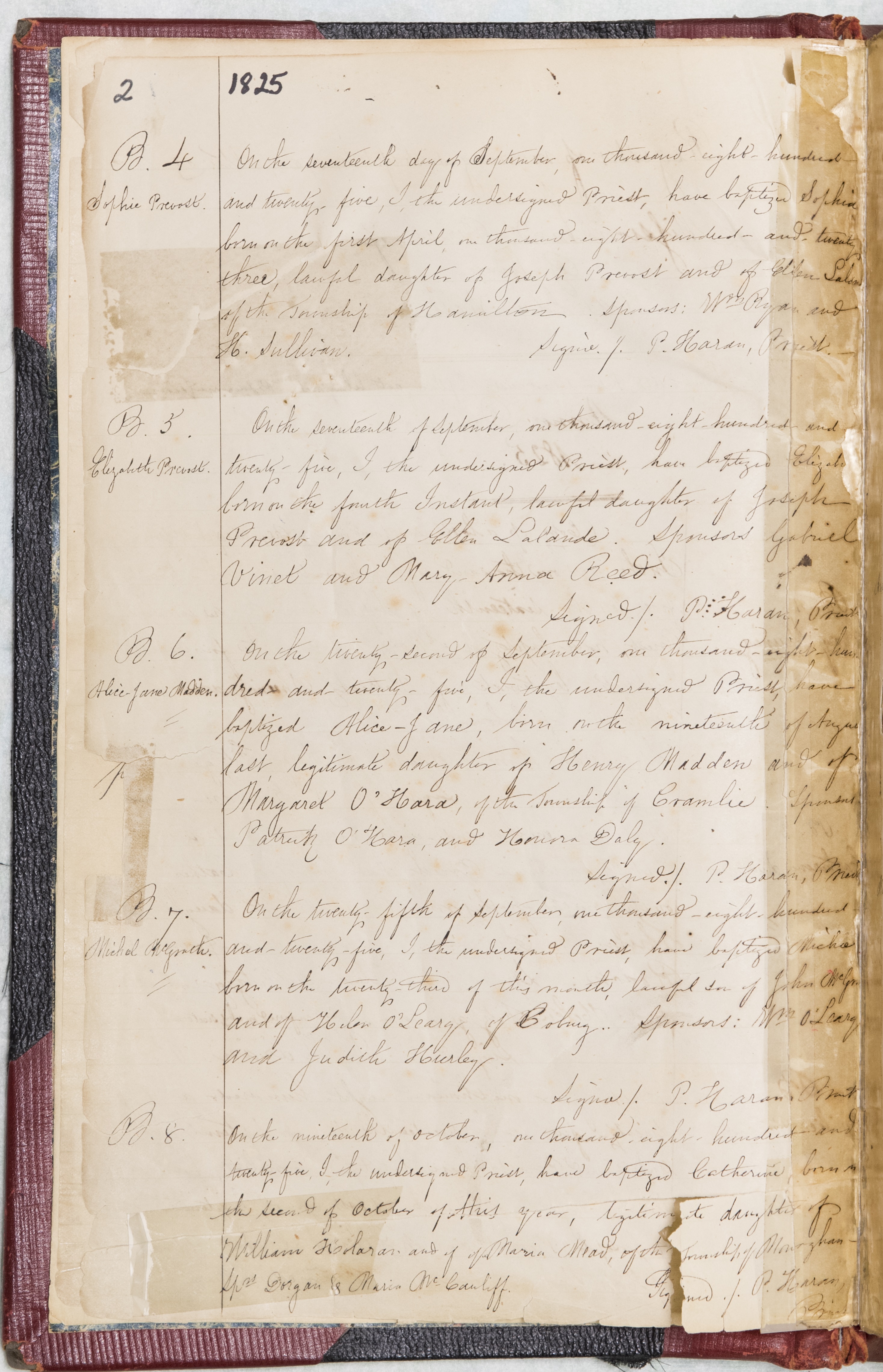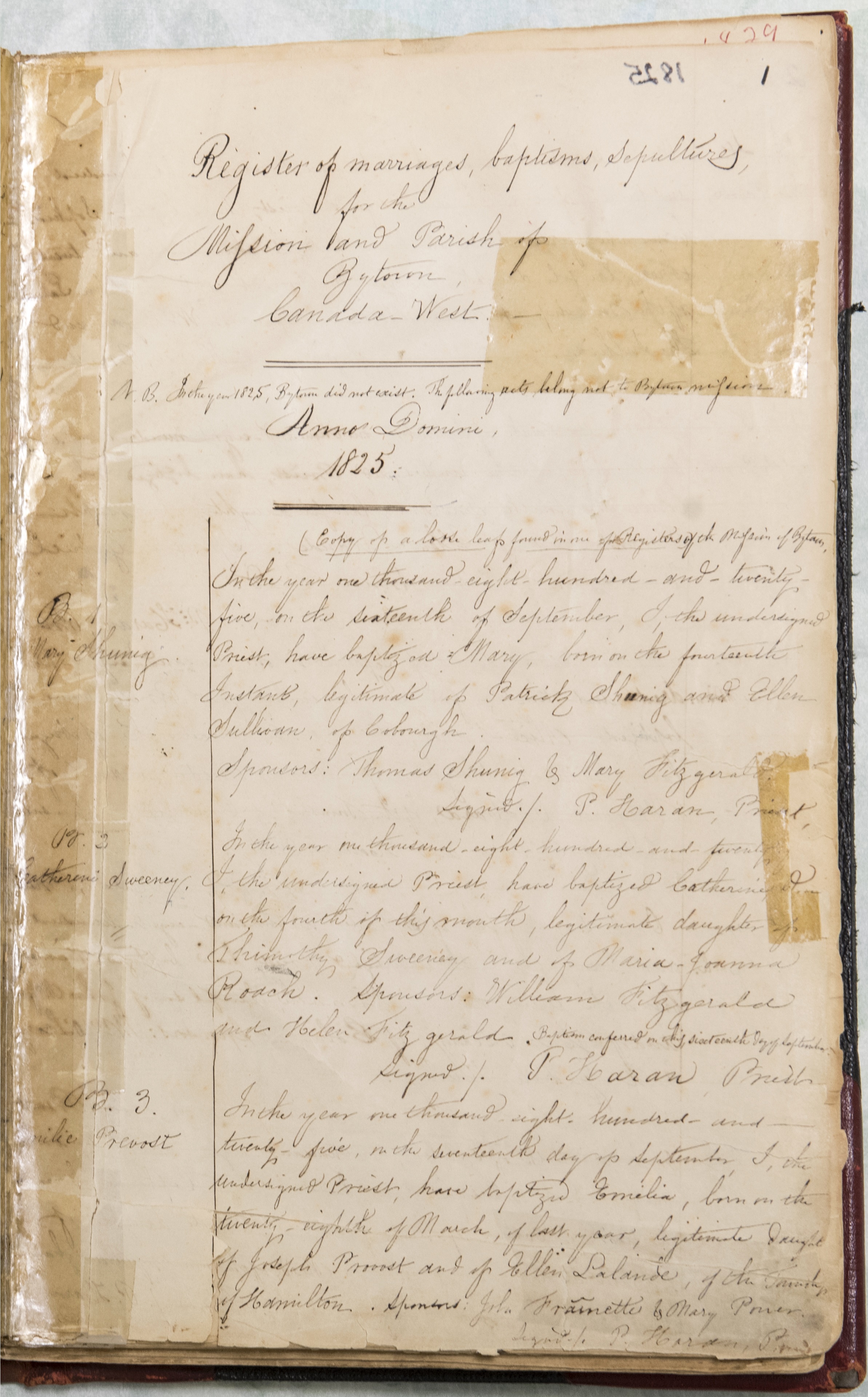 Dans son étude des pionniers canadiens-français de Bytown, Georgette Lamoureux relate que les premiers baptêmes d’enfants canadiens-français enregistrés à la paroisse Notre-Dame d’Ottawa sont « ceux d’Émélia, née en 1824 et de sa sœur Sophie, née en 1825, filles de Joseph Prévost, de Hamilton, et d’Ellen Lalande1». Ces inscriptions datent d’avant le début de la construction du canal Rideau en 1827. Elles remontent ainsi à la période qui précède l’installation d’un premier prêtre dans la région, et sont donc probablement le fait d’un missionnaire. « L’enregistrement qui suit est celui de Maria Anastasia, née en 1828, fille de John Bélisle et de Marie-Louise Beauchamp ». Puis vient le nom d’Émélia Pinard, née le 25 juin 1829, de Lewis (Louis) Pinard et de Catherine Alexandre. De la famille Pinard, Georgette Lamoureux dira que six des seize enfants de Joseph-Marie Pinard et de Françoise Côté, de Nicolet, s’installent à Bytown, alors qu’un septième s’établit à Hull. Louis vient à Bytown pendant la construction du canal, ses frères et sa sœur le rejoignent plus tard.