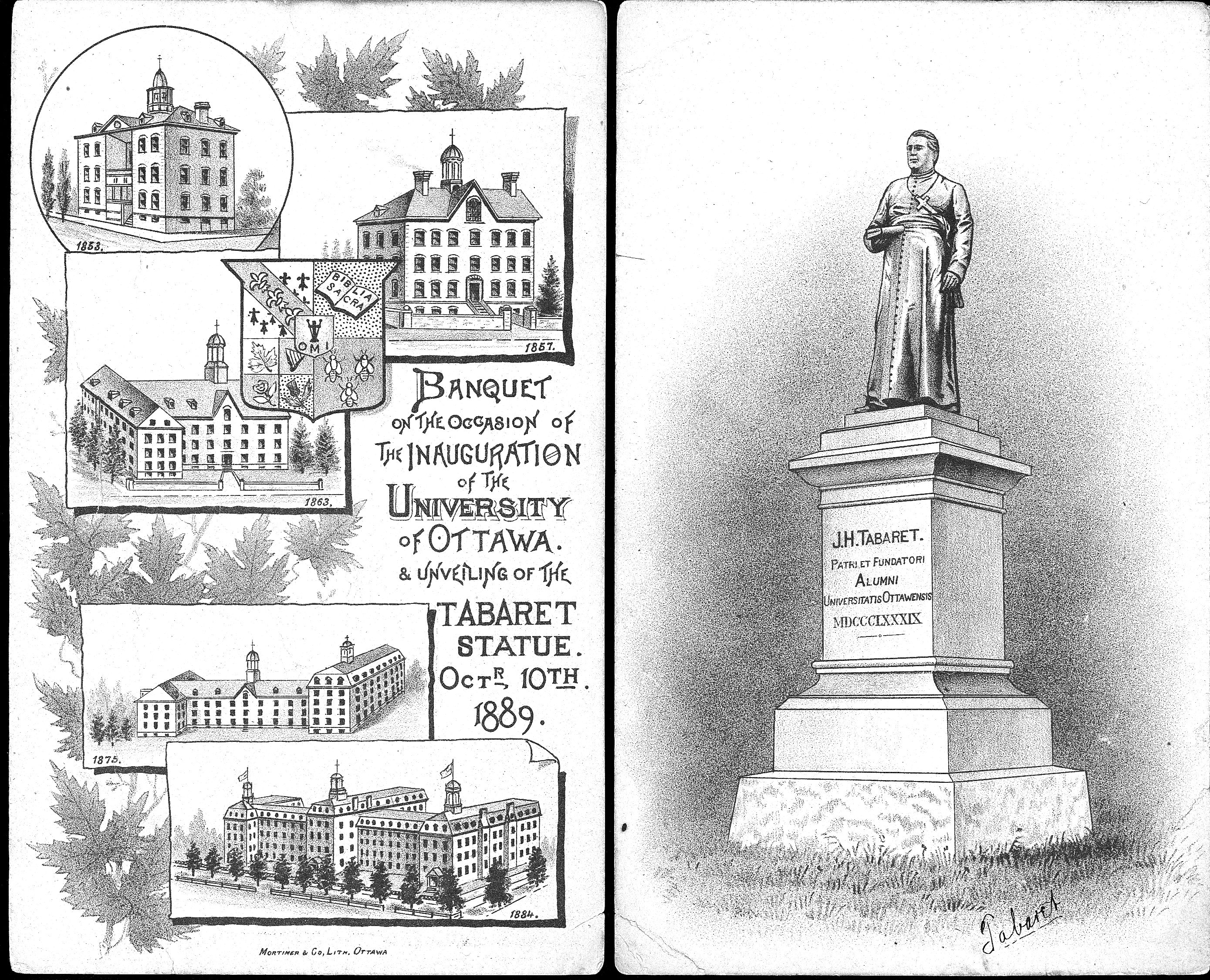 Programme de l'inauguration de l'Université d'Ottawa et du dévoilement de la statue du père Joseph-Henri Tabaret, 10 octobre 1889. Sur la page couverture, on voit des dessins de l'édifice du Collège de Bytown, situé rue Sussex en 1853, et des dessins des quatre étapes de la construction de l'édifice de l'Université d'Ottawa, entre 1857 et 1884.