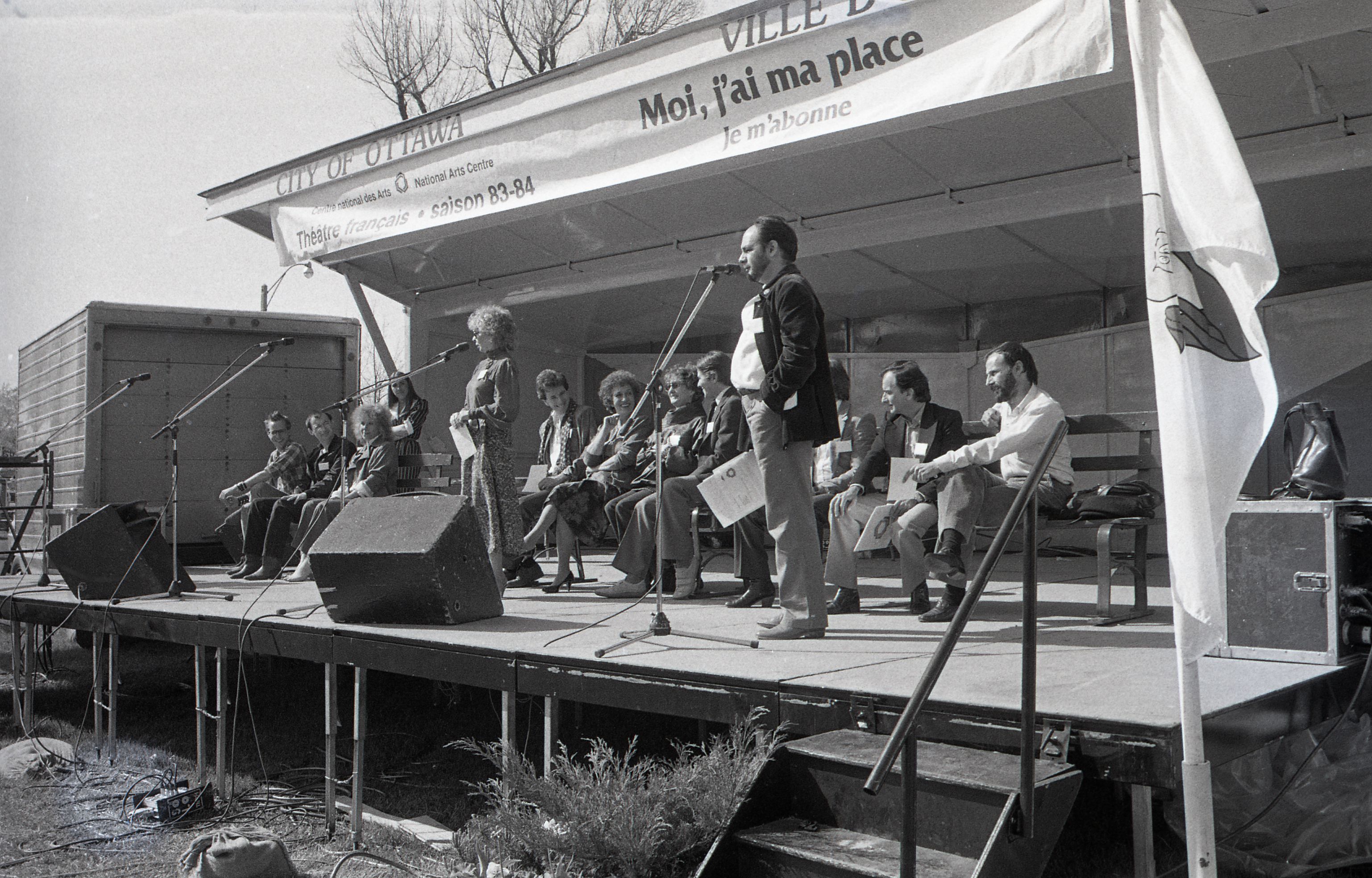 Rencontre de presse du Centre national des Arts pour le lancement de la saison du Théâtre français 83-84, 18 mai 1983. Dès son ouverture en 1969, le CNA présente deux saisons théâtrales, l’une en français et l’autre en anglais. Photo : Michel Lafleur.