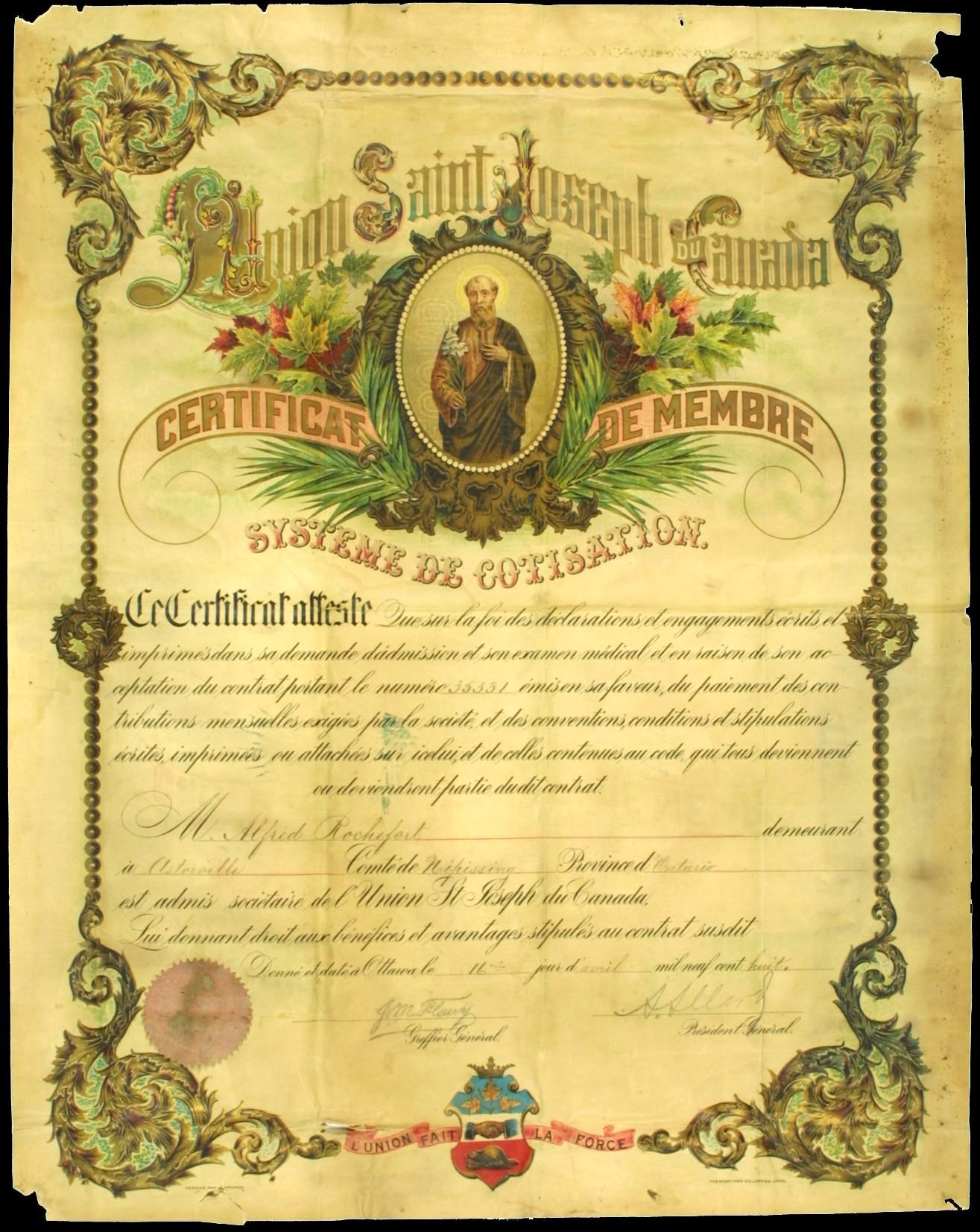 Certificat de membre de l'Union Saint-Joseph d'Ottawa, no 35331, Alfred Rochefort, Ottawa, 16 avril 1908. La société offre à ses membres une sécurité sociale en cas de maladie ou de décès, qui leur évite d’avoir recours à l’assistance publique, une solution qui est alors très mal perçue dans la plupart des milieux. Ceux-ci doivent, pour être admis, fournir un certificat médical.