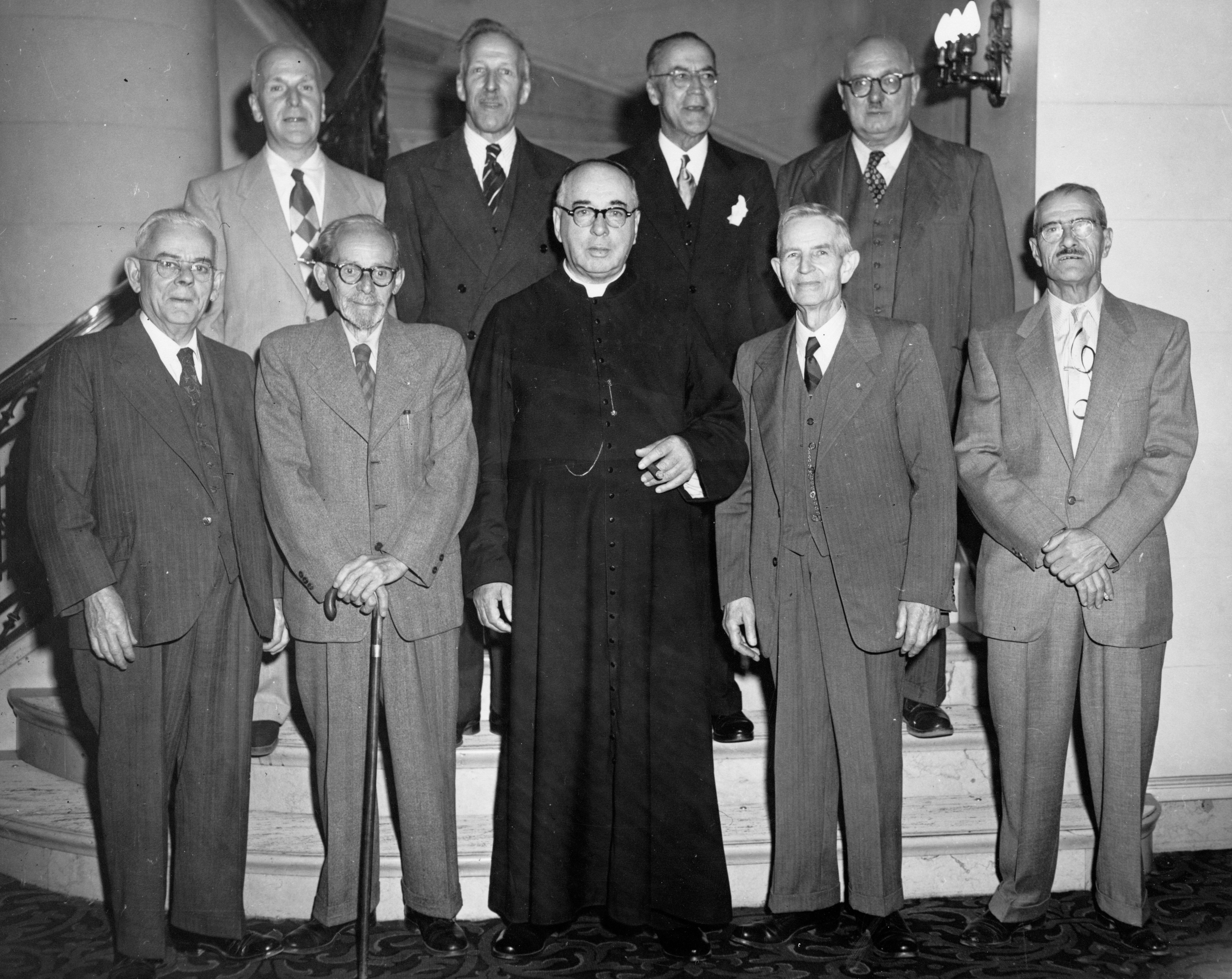 Neuf fondateurs de l'Ordre de Jacques-Cartier, lors d'une réunion plénière de la CX (Chancellerie) au Château Laurier soulignant le vingt-cinquième anniversaire de l'Ordre. À l'avant, Adélard Chartrand, Émile Lavoie, F.-X. Barrette, Esdras Terrien et Louis-Joseph Châtelain; à l'arrière, Oscar Barrette, Philippe Dubois, Achille Pelletier et Charles Gautier, Ottawa, 28 septembre 1952. Photo : Champlain Marcil.