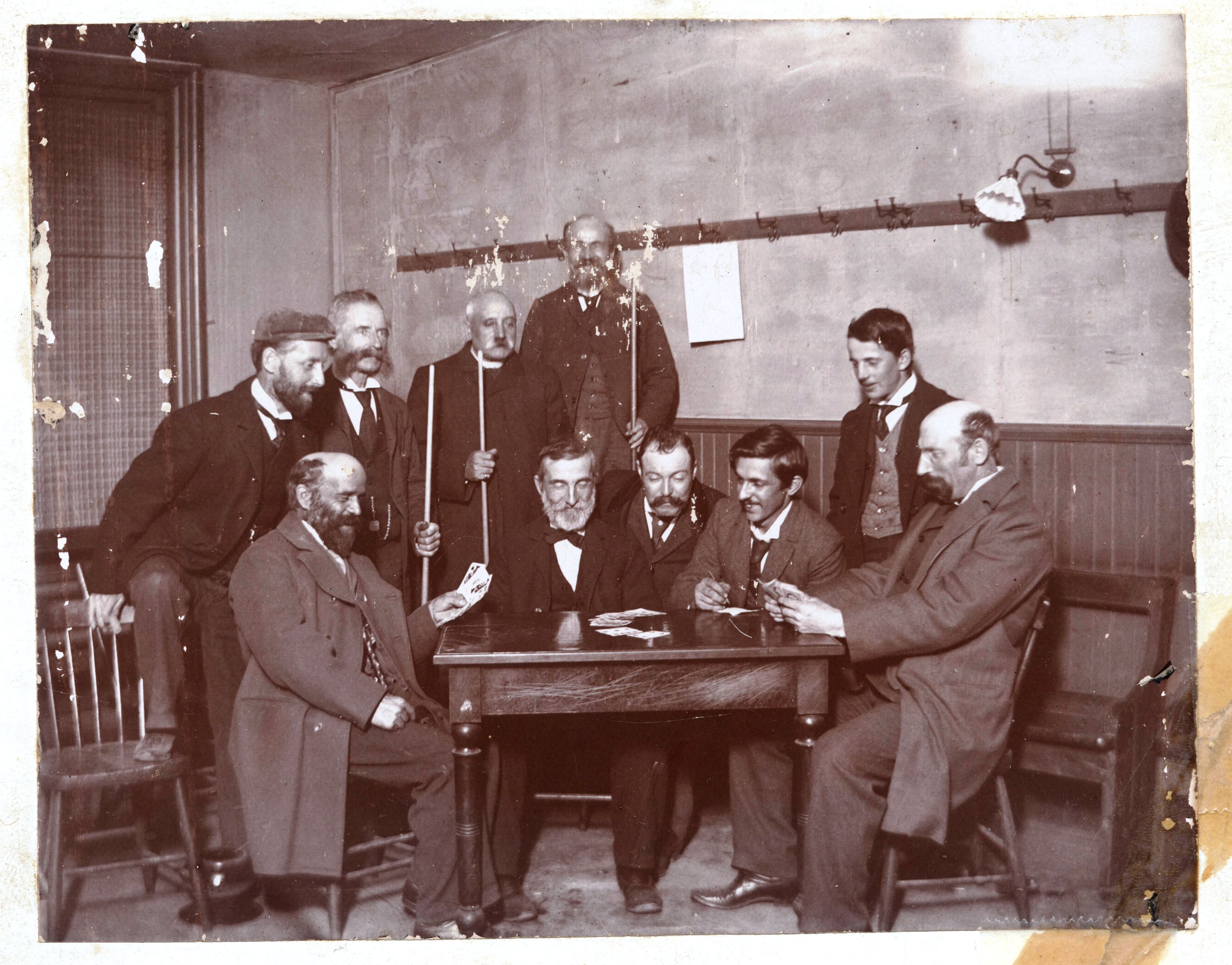 Des membres de l’Institut canadien-français d’Ottawa, joueurs de cartes et de billard, dans la salle de l’Institut, Ottawa, [ca 1890].