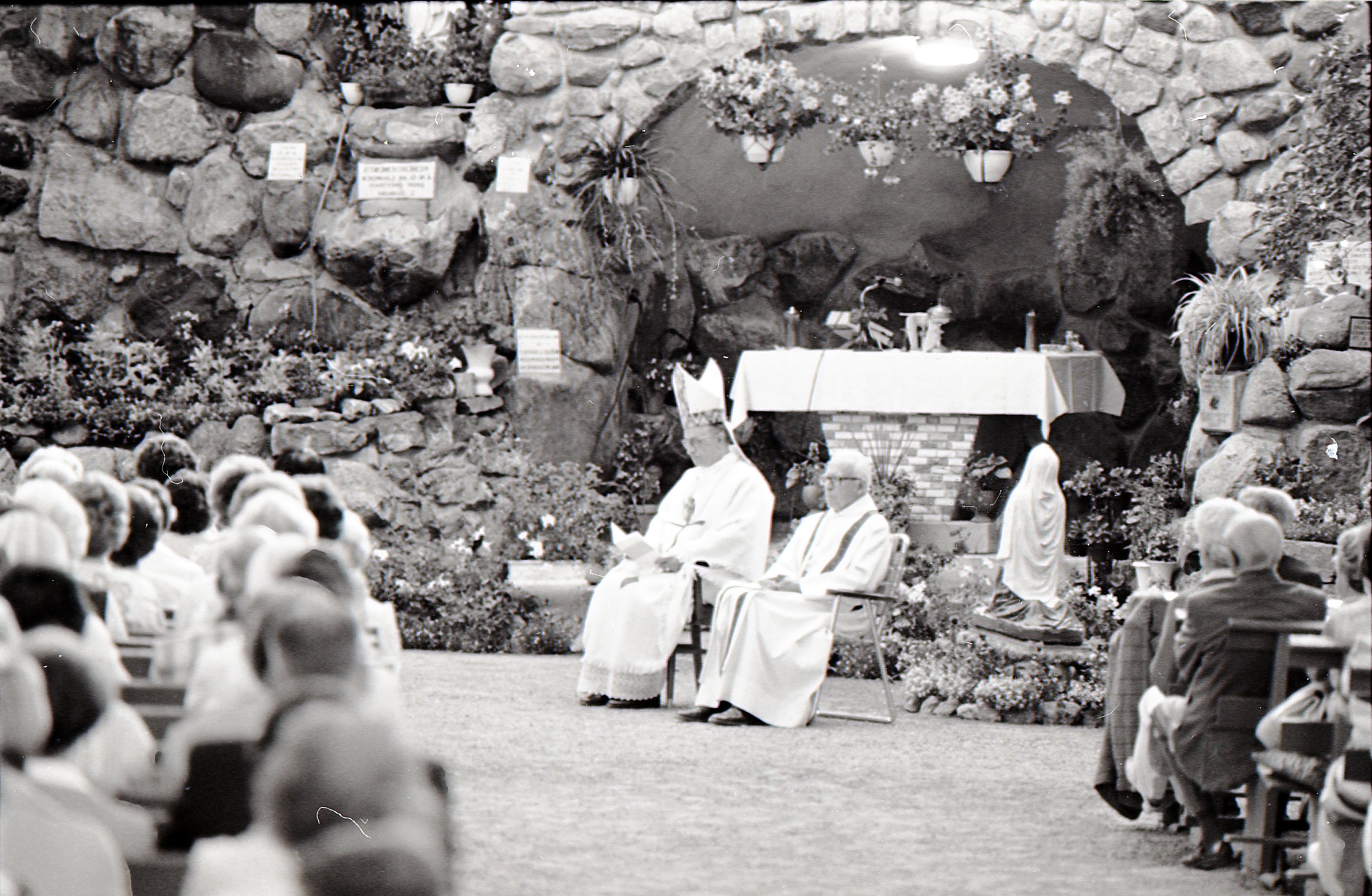 Célébration de la messe lors du 125e anniversaire de la paroisse Notre-Dame-de-Lourdes, fondée en 1854. Grotte Notre-Dame de Lourdes, Vanier, 19 juillet 1979. Photo: Le Droit.