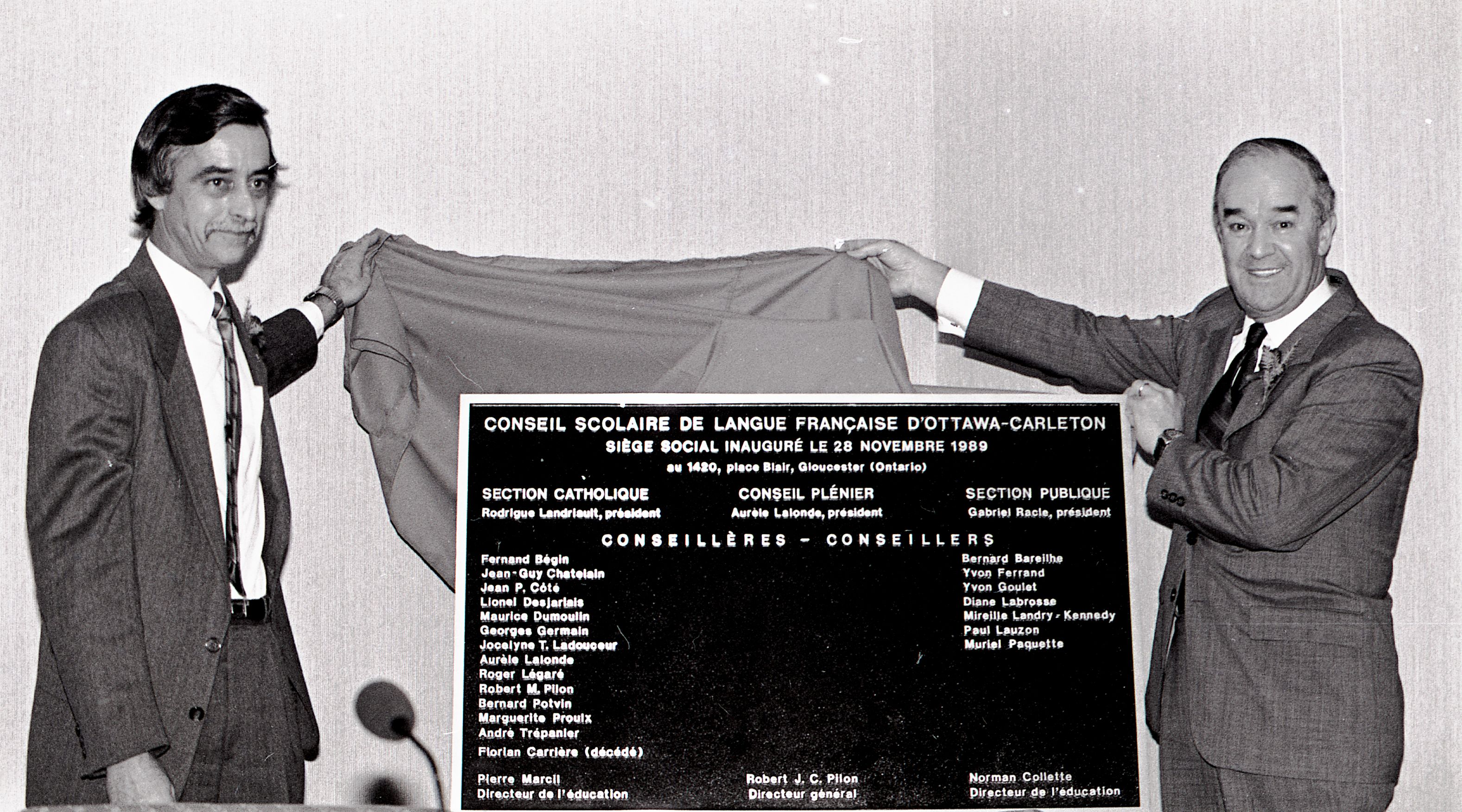 Inauguration du Conseil scolaire de langue française [d’]Ott[awa-]Carleton. À la gauche, le président Aurèle Lalonde. Photo: M [ichel] Tessier, Le Droit, le 28 novembre 1989.