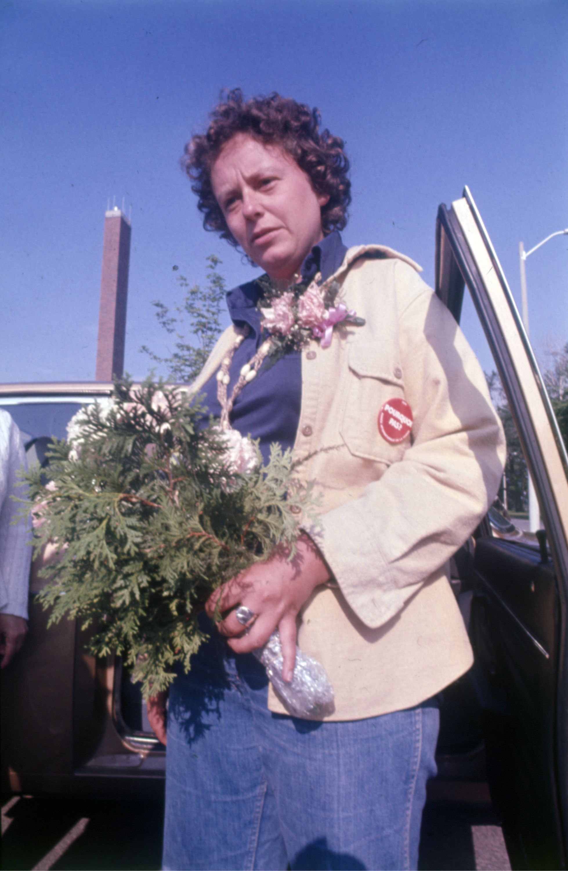 Jacqueline Pelletier avec le bouquet de fleurs offert par ses amis et sympathisants à sa sortie de prison, incarcérée suite à son refus de payer une contravention unilingue, 16 juin 1975. Photo : Gilles Benoît, Le Droit.