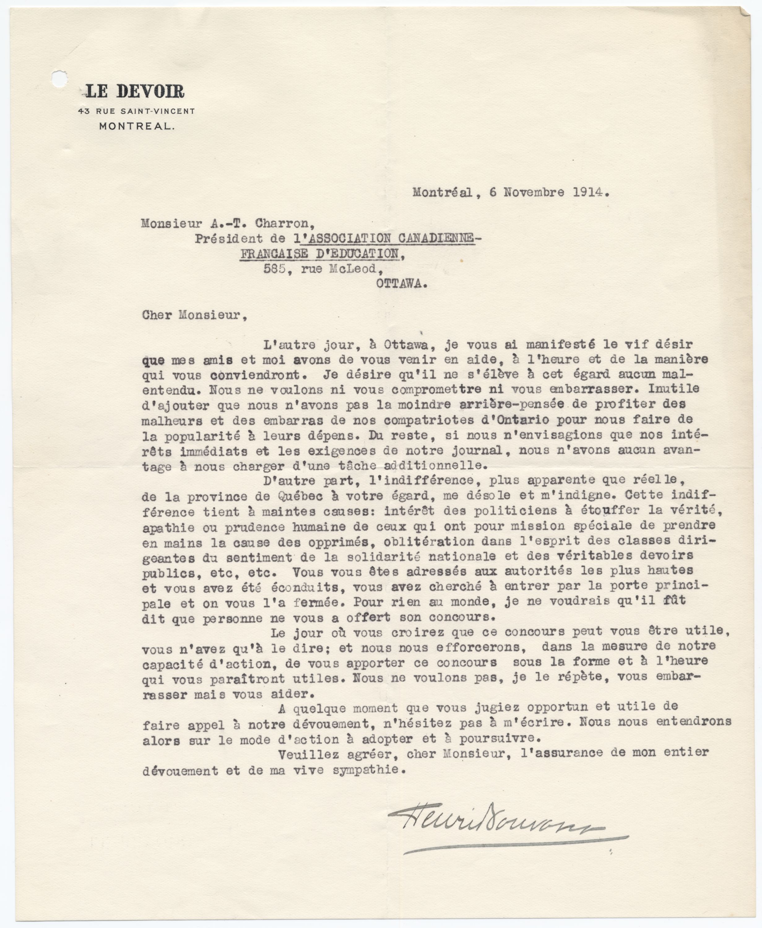 In 1912, the Government of Ontario adopts a measure that triggers an unprecedented crisis at the provincial scale. Regulation 17 limits French – as the language of instruction and communication – to the first two years of primary education in Ontario schools. As soon as the Regulation is promulgated, Francophones organize themselves and wage a relentless battle to maintain their educational rights. Ottawa is the nerve centre of the struggle.