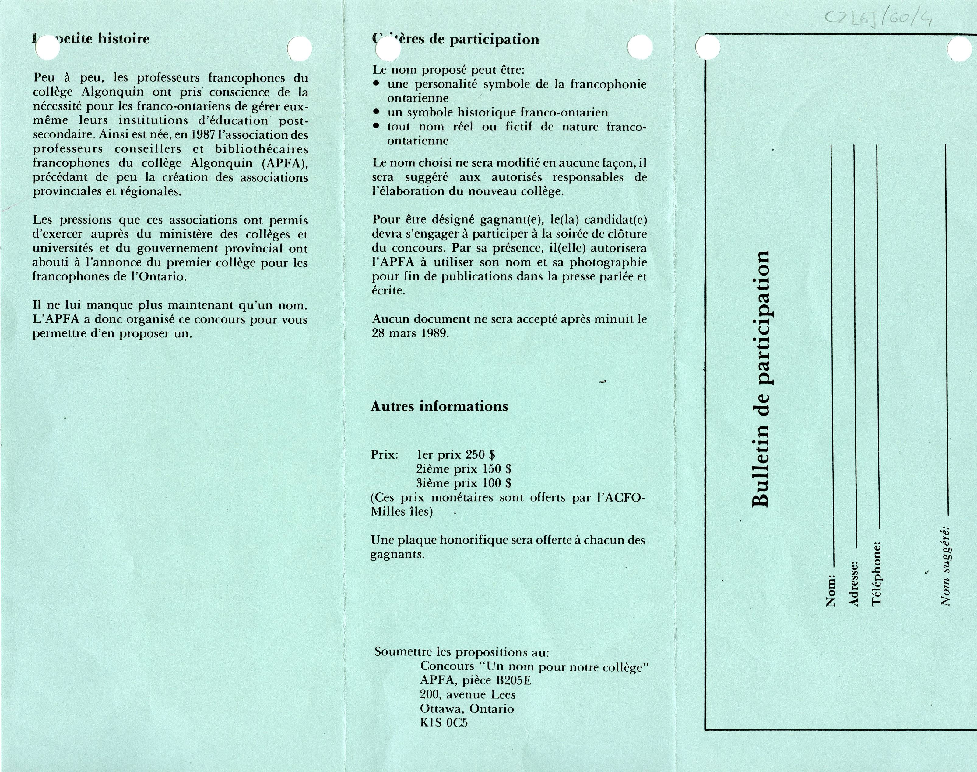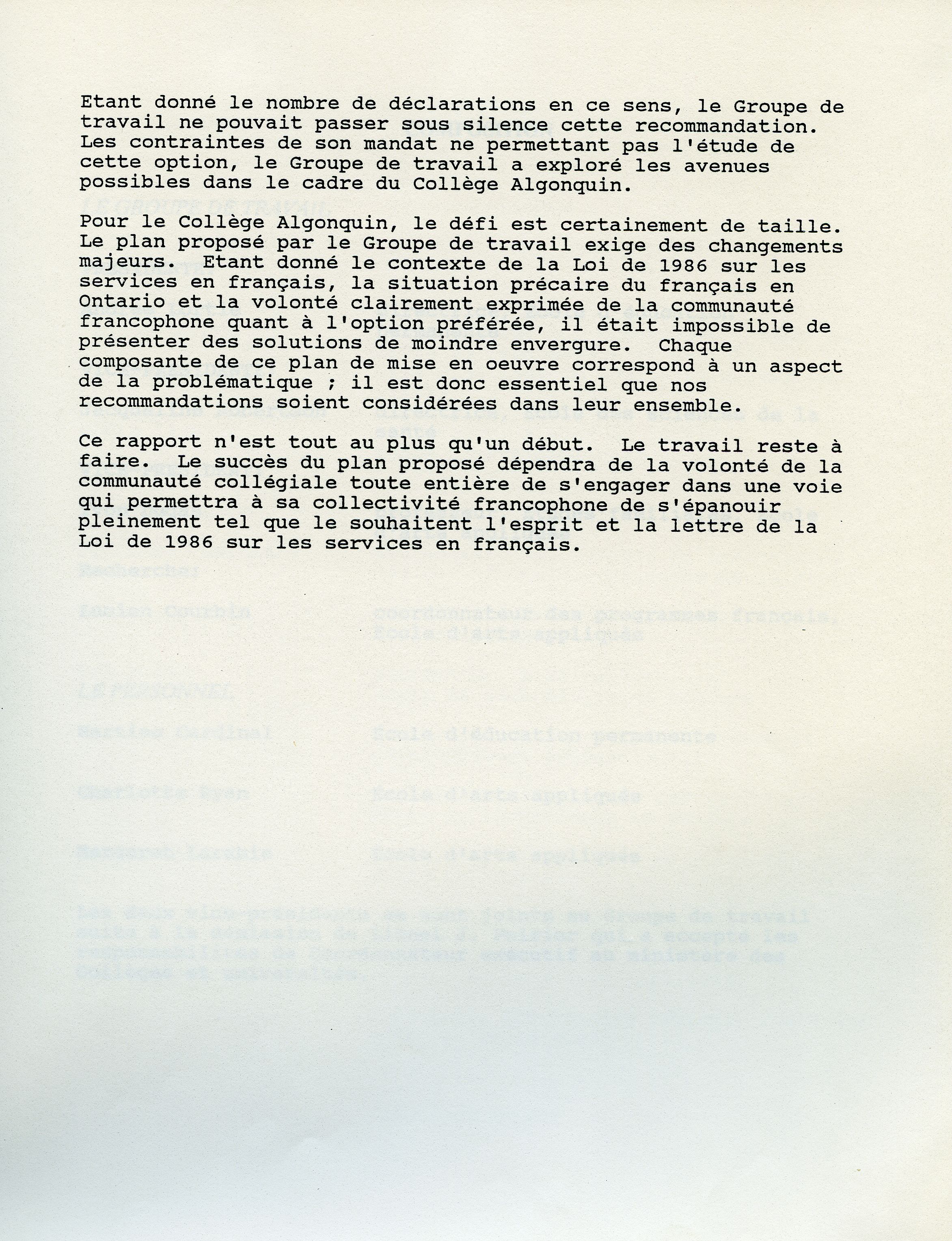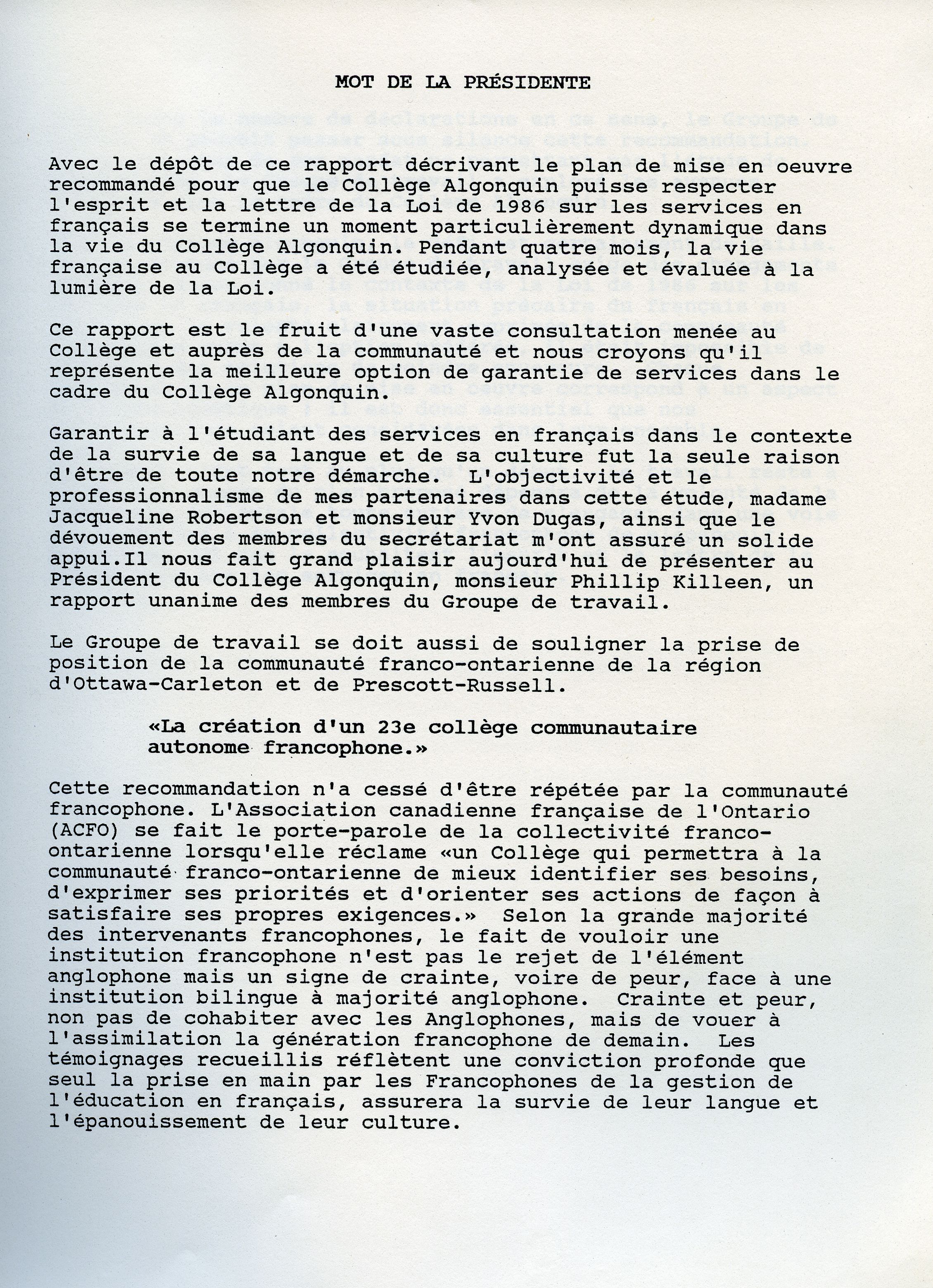 In November 1987, the Lortie Report – named after the Chair of the Task Force studying the designation of Algonquin College as a French-language institution under the French Language Services Act – drops a bombshell. The French sector of the college must be granted full autonomy. The announcement begins one of the most important concerted movements in the history of French Ontario, which leads to the opening of La Cité collégiale in Ottawa barely two years later.