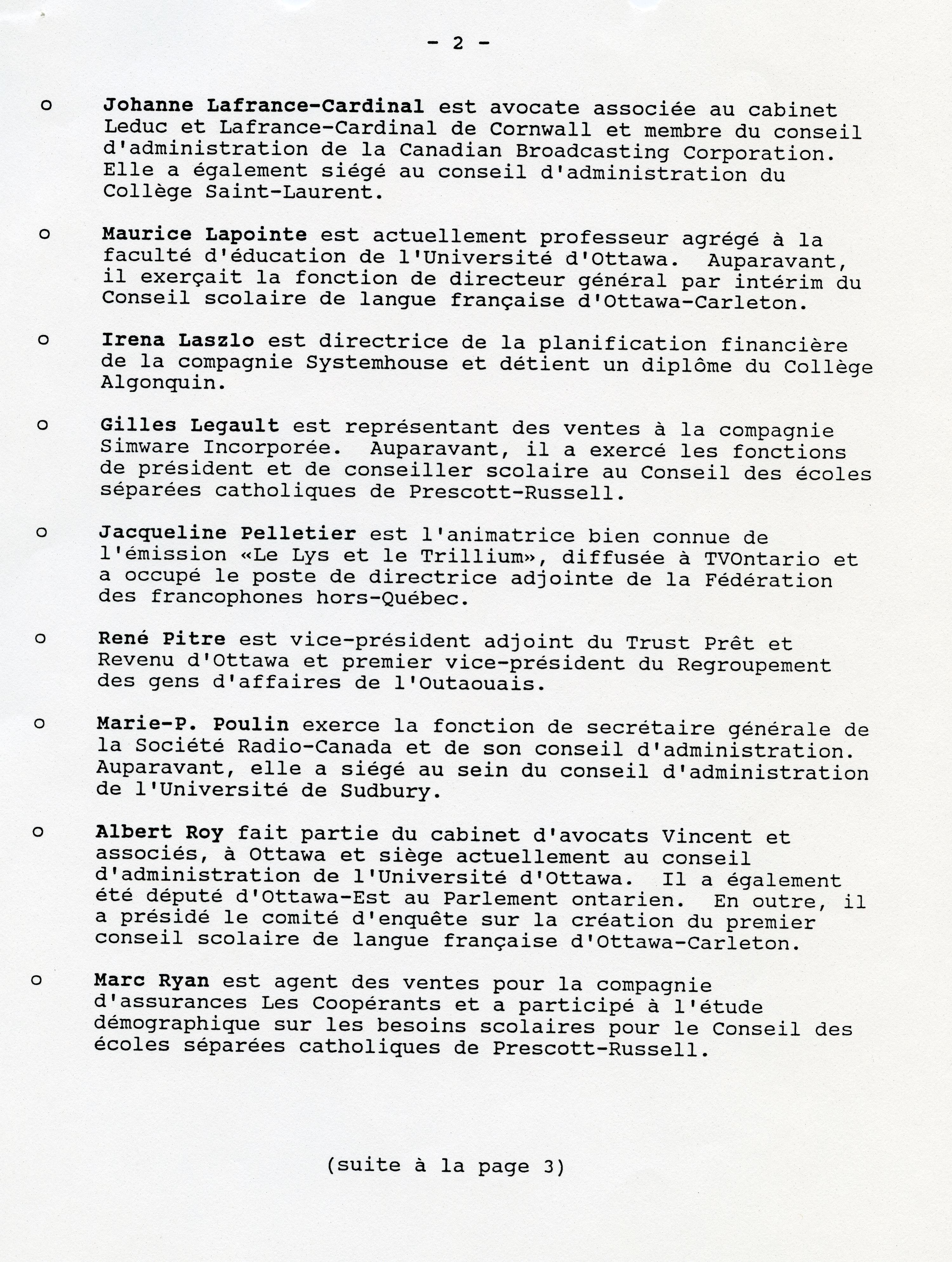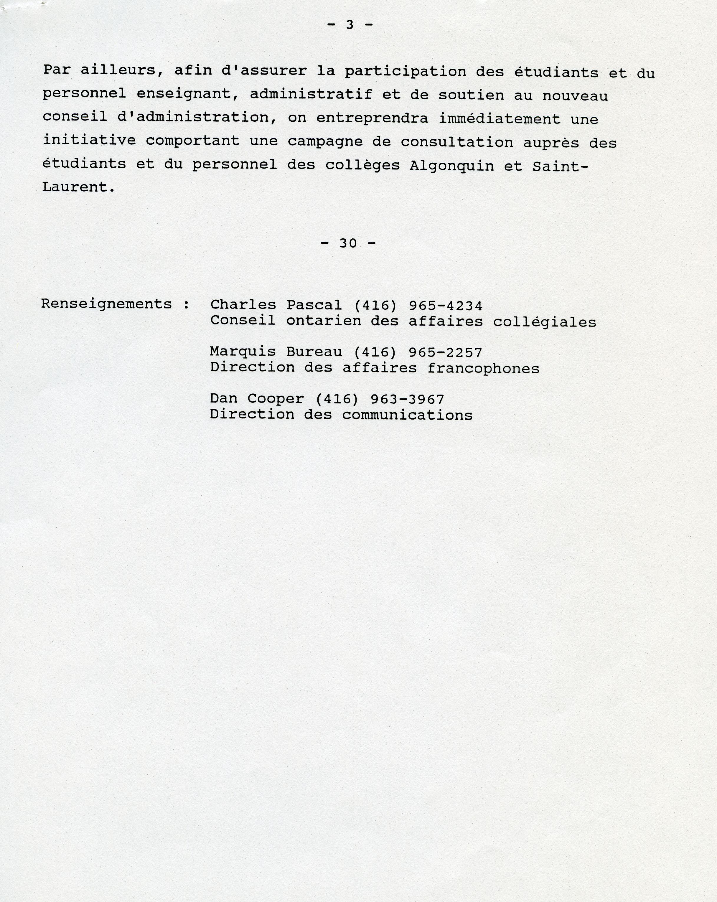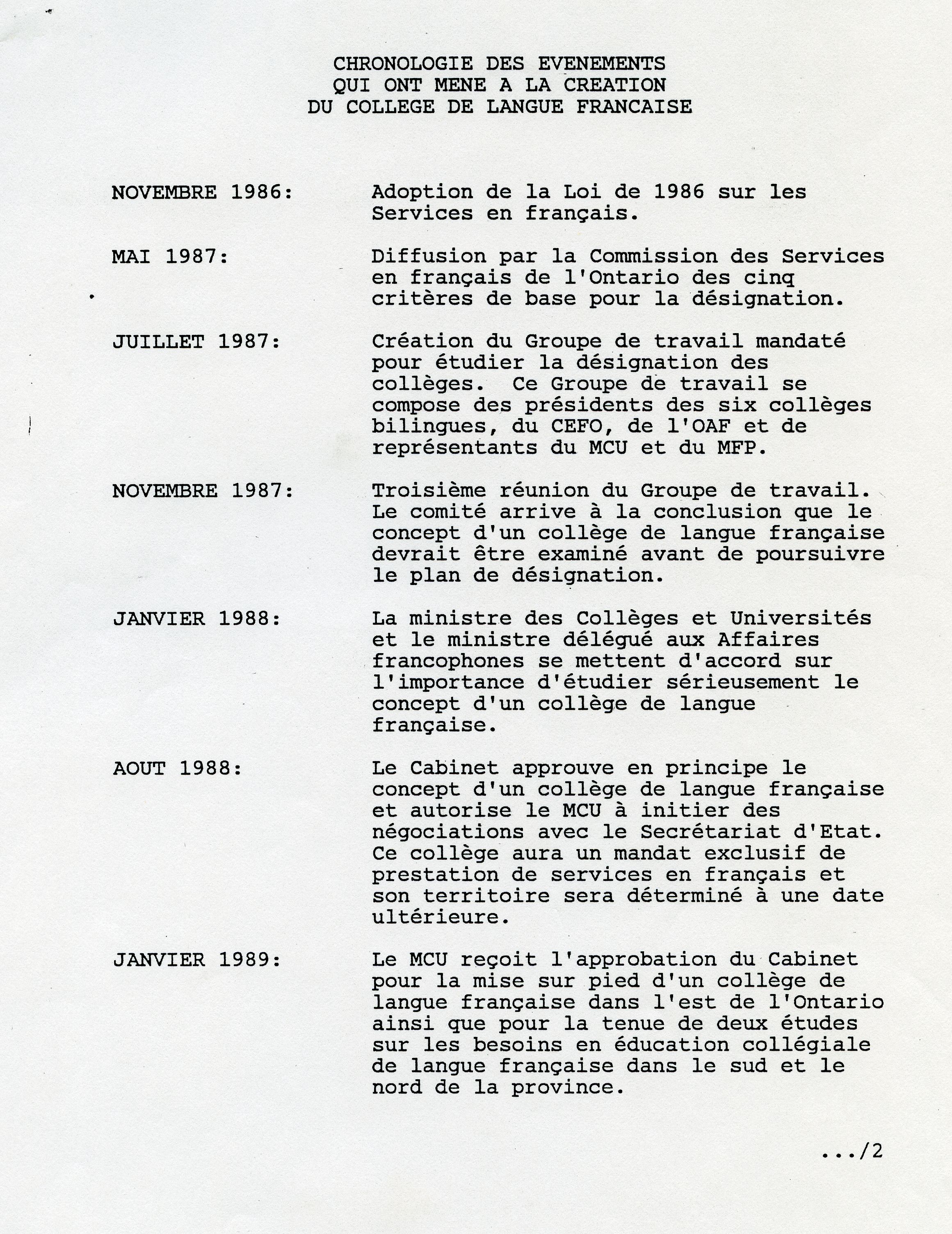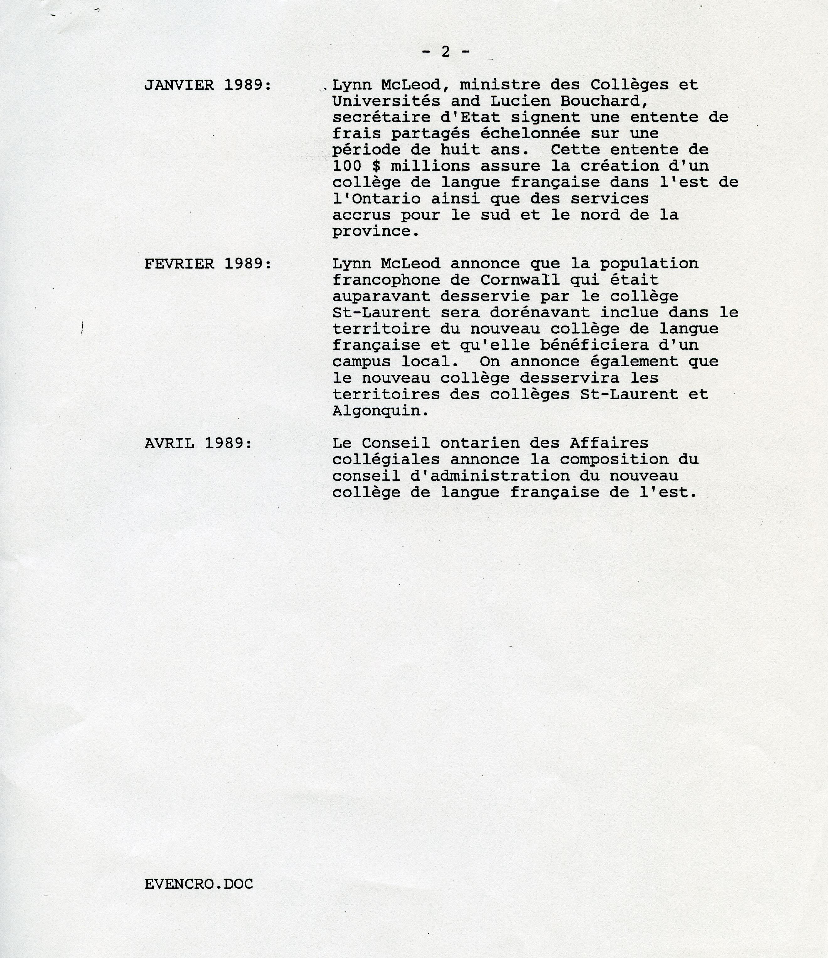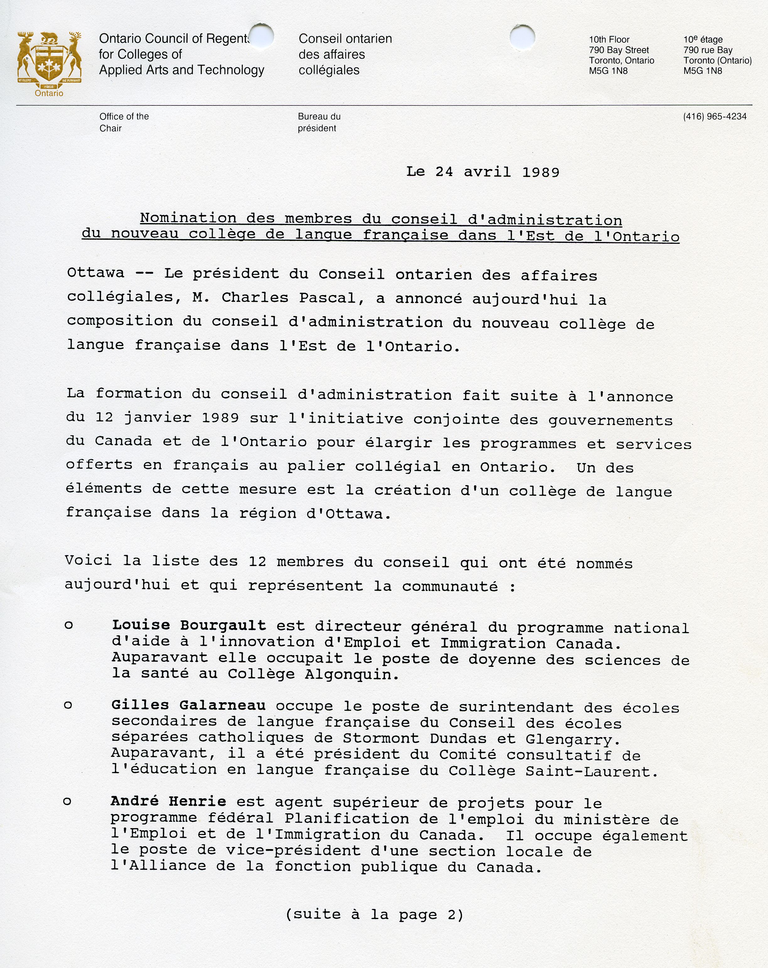 It is Francophones at the college, dispersed among the many teams involved in producing the report, who launch the offensive. Galvanized by the Peterson government’s commitment to soon create the first French-language school boards, they bring together the province’s leading education organizations, and set in motion a particularly well-orchestrated lobbying plan. On January 12, 1989, Lucien Bouchard, Secretary of State, and Lyn McLeod, Ontario’s Minister of Colleges and Universities, announce the creation the first French-language community college in Ontario. A board of directors is appointed to establish an institution that meets the community’s expectations.
